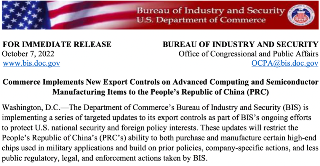 2022年10月7日,美国商务部工业和安全局发布半导体出口管制新规。图源:美国商务部网站