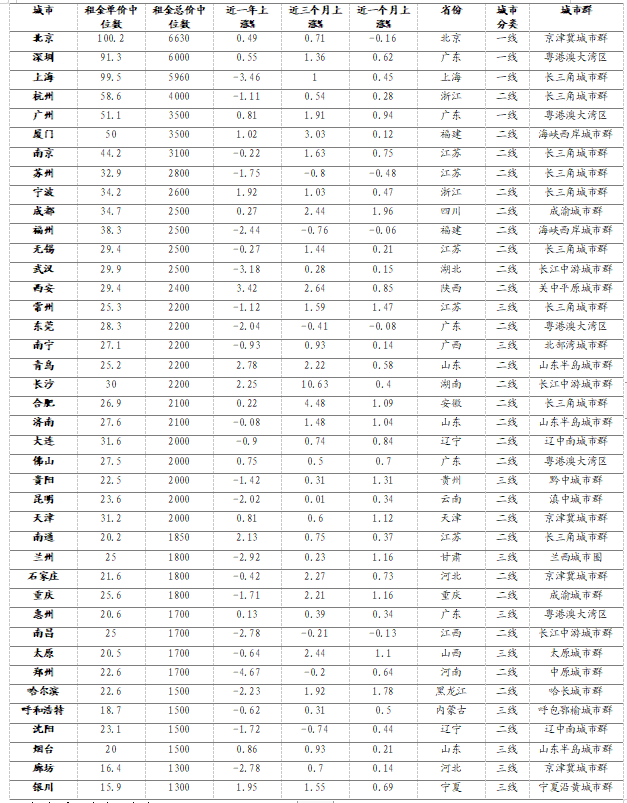 2.租金水平相对平稳,二季度季节性小幅上涨,但上半年总体略低于去年同期租金水平
