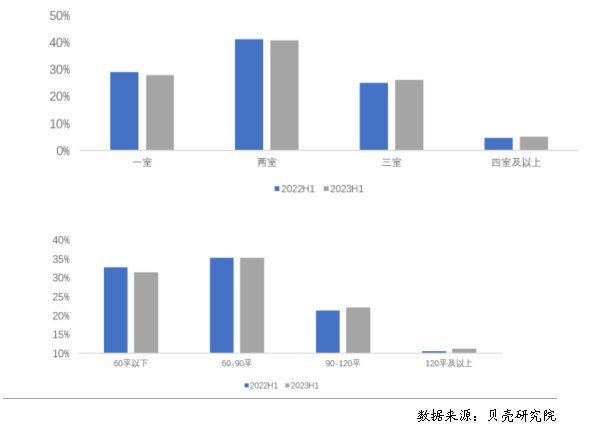 上半年租赁成交中两居室、60-90平米房源占比最高。根据贝壳研究院数据,2023年上半年重点40城两居室成交占比最高,占比40.8%,其次为一居室,占比27.9%;租赁成交中面积段为60-90平米的占比达到35.2%,其次为60平米以下,占比为31.5%。对比去年同期,2023年上半年租赁成交结构相对稳定,租客对于一居室、两居室的小户型租赁房源需求仍保持旺盛。一居室或60平米以下的占比略有减少,部分对一居室有需求的租客或转向了租赁集中式长租公寓,尤其是保障性租赁住房。