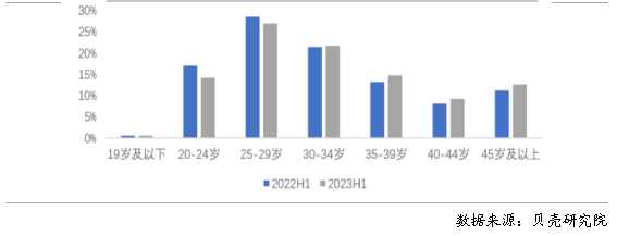 图6 2022年上半年、2023年上半年重点40城租客年龄结构分布