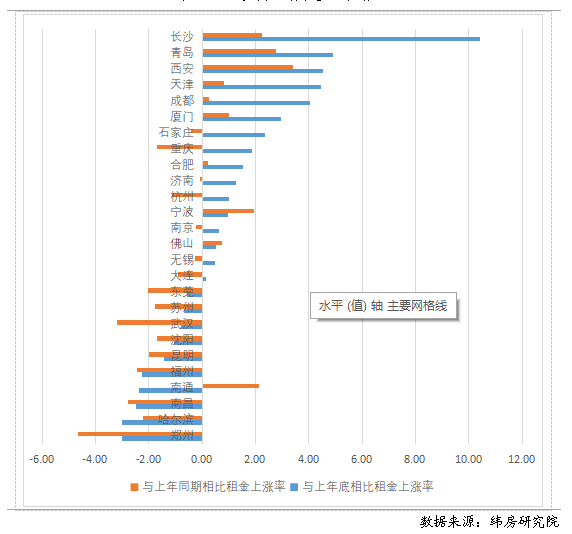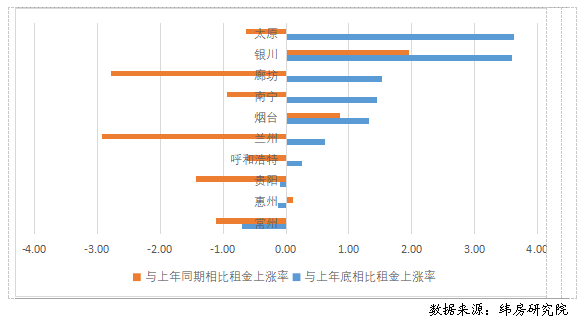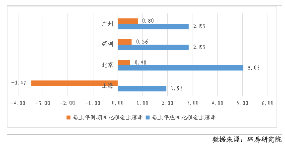 与去年同期相比,一线城市住房租金以微涨为主,其中广州住房租金上涨0.80%,深圳上涨0.56%,北京上涨0.48%,但上海下降3.47%。