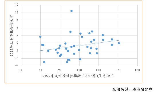 图9 2023年上半年重点40城住房租金增长率与2022年底住房租金指数关系