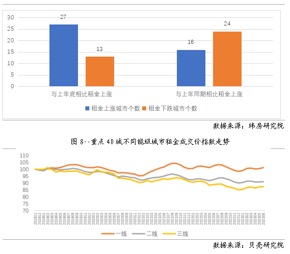 分城市来看,上半年多数城市住房租赁市场活跃度同比提高,但租金还未回升至去年同期水平。