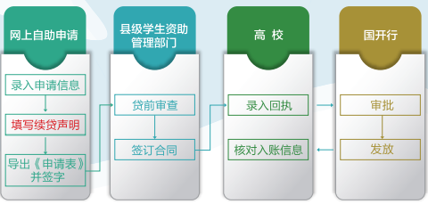 (1)在前往县级学生资助管理部门办理续贷手续前,请先登录学生在线系统更新个人及共同借款人相关信息,再提出续贷申请。按照系统提示填写续贷声明后,打印《申请表》并签字。