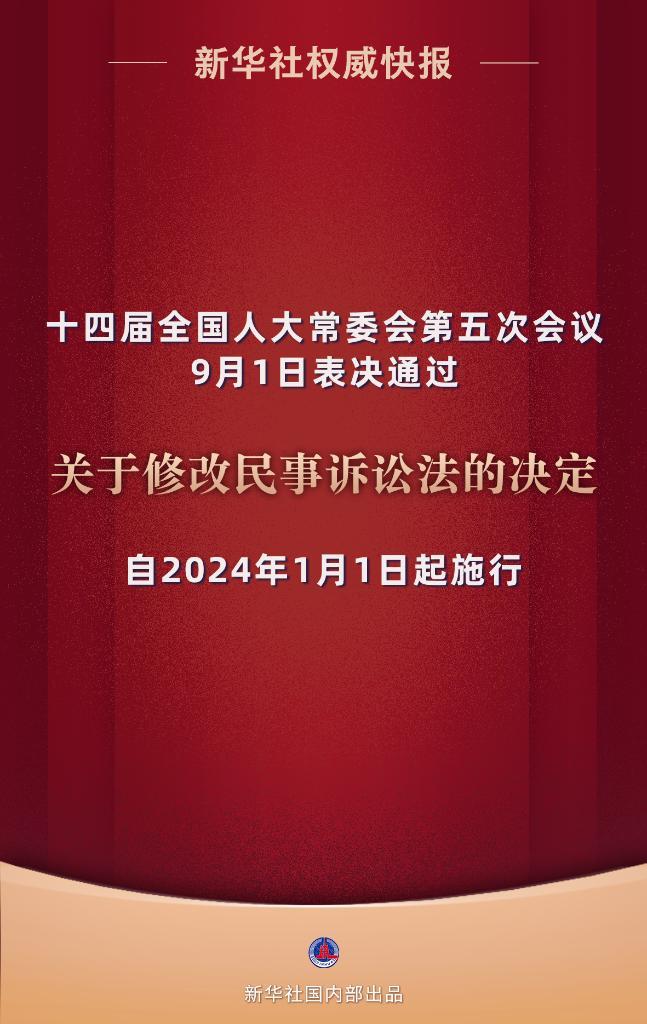 9月1日,十四届全国人大常委会第五次会议表决通过关于修改民事诉讼法的决定,自2024年1月1日起施行。