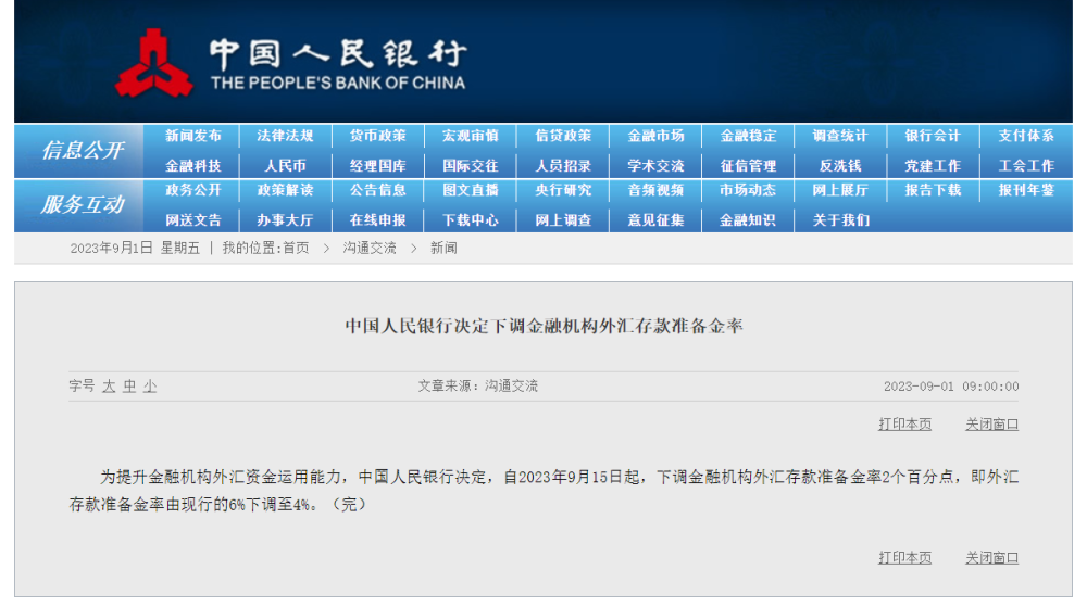 为提升金融机构外汇资金运用能力,中国人民银行决定,自2023年9月15日起,下调金融机构外汇存款准备金率2个百分点,即外汇存款准备金率由现行的6%下调至4%。