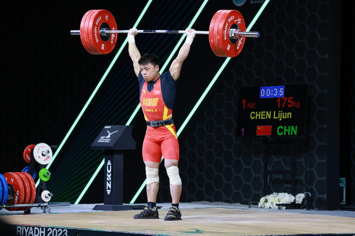 谌利军在抓举上优势很大,他稳稳举起开把的145公斤,第二次和第三次又分别成功举起150公斤和153公斤,以绝对实力将抓举金牌收入囊中。