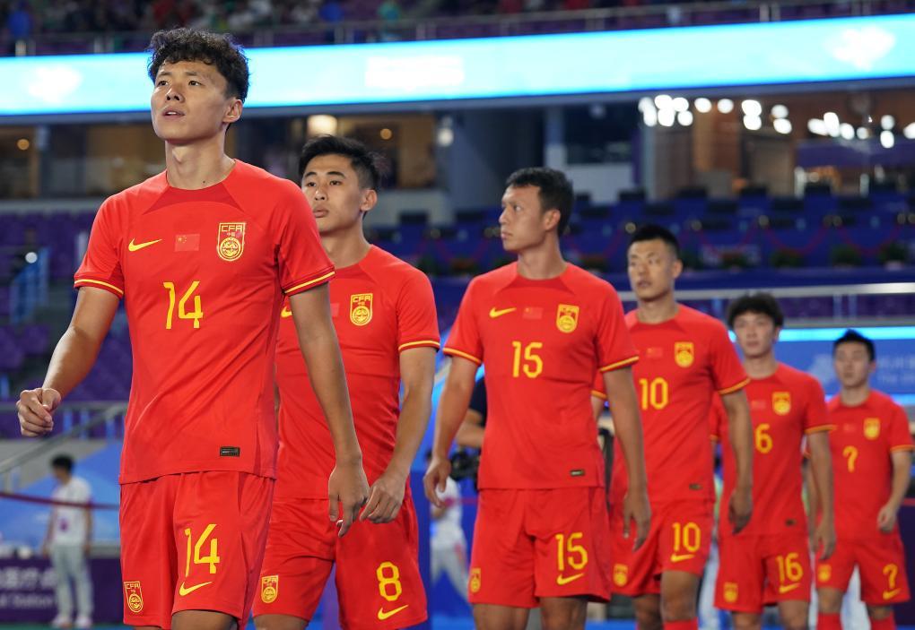 9月19日,中国男足亚运队球员在比赛前入场。新华社记者 杜宇 摄
