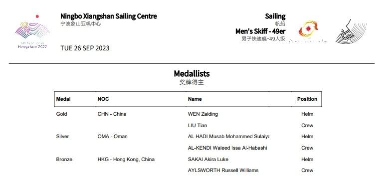 9月27日,杭州亚运会赛事组委会正式宣布,在26日结束的杭州亚运会帆船男子快速艇-49人级比赛中,中国选手温在鼎/刘添获得冠军。