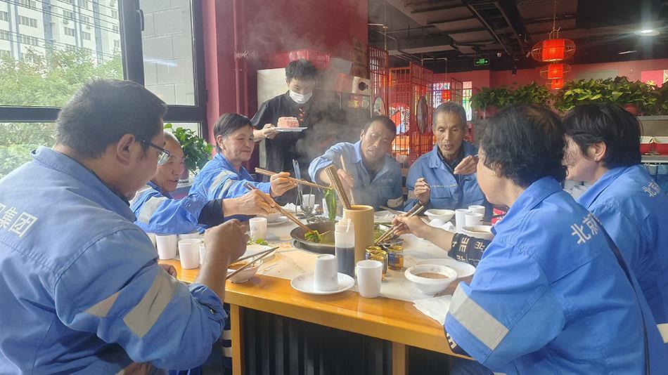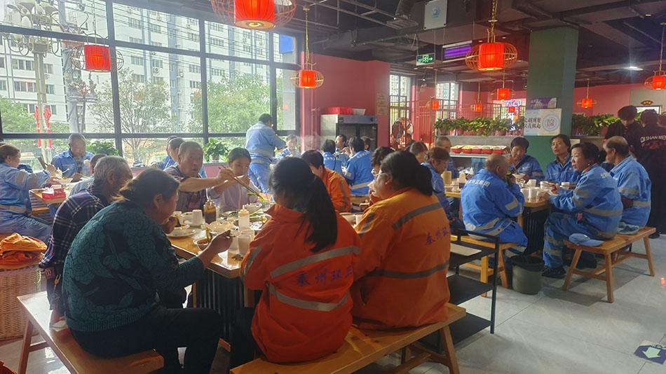 “好久没和大家聚一起了,非常感谢这个火锅店,菜味道非常好,菜的份量比较多,国庆节和大家聚一下,我们非常高兴。” 环卫工人刘辉说。
