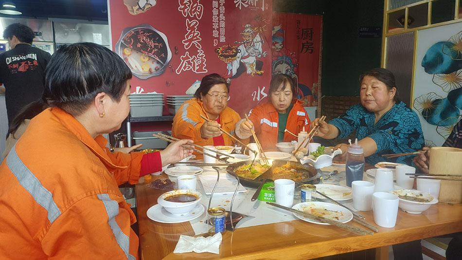 中午时分,清洁羲皇大道的32名环卫工人们忙完手头的工作,陆陆续续来到了火锅店,受邀免费吃火锅。他们五六个人一桌围坐在一起,不多时,20余道新鲜食材摆满了桌子,大家边涮火锅边聊天,处处都是欢声笑语。