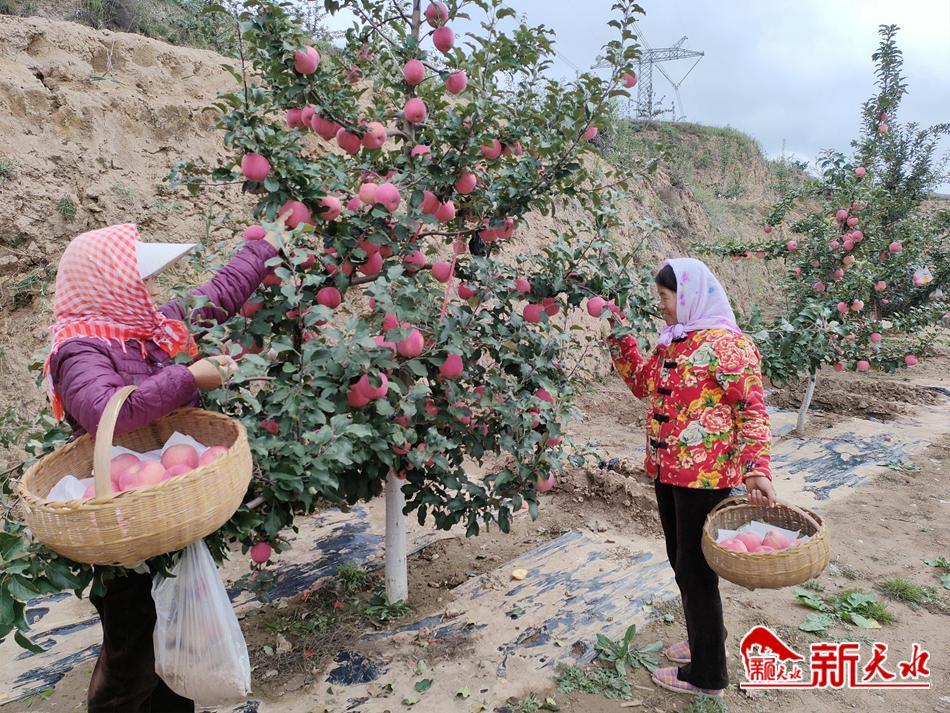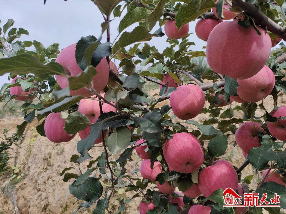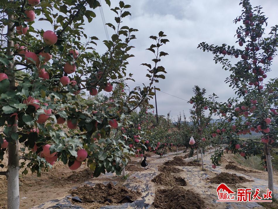 新天水讯 【记者 余碧波 通讯员 李全胜】金秋时节,武山县嘴头乡高山富士苹果陆续成熟。在金银村的山山峁峁,连片的果树整齐排列。苹果园里,硕果累累,红彤彤的苹果宛若一串串红灯笼挂满枝头,空气中弥漫着浓郁的果香,果农们脸上洋溢着丰收的喜悦。绿树红果和忙碌的果农构成秋日美丽的丰收画卷。