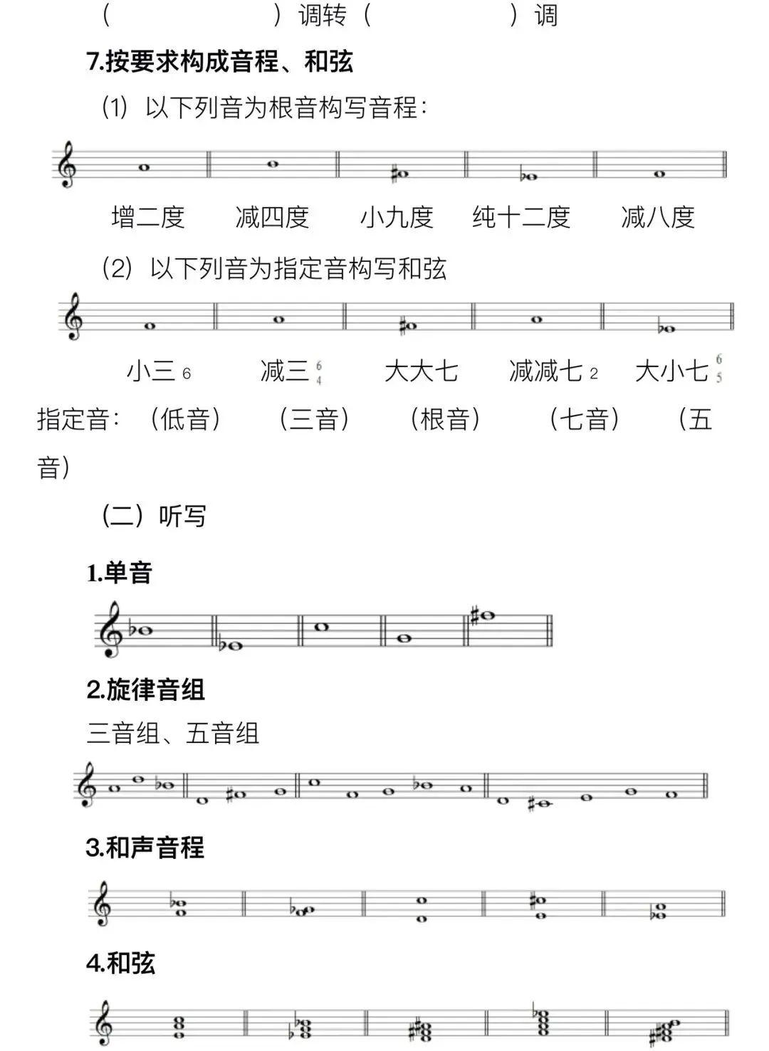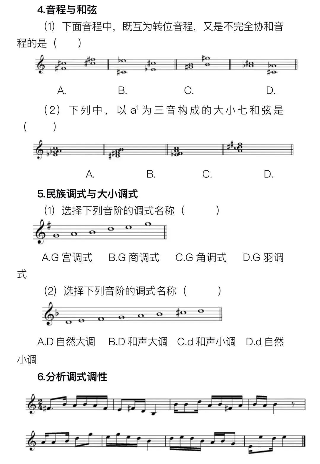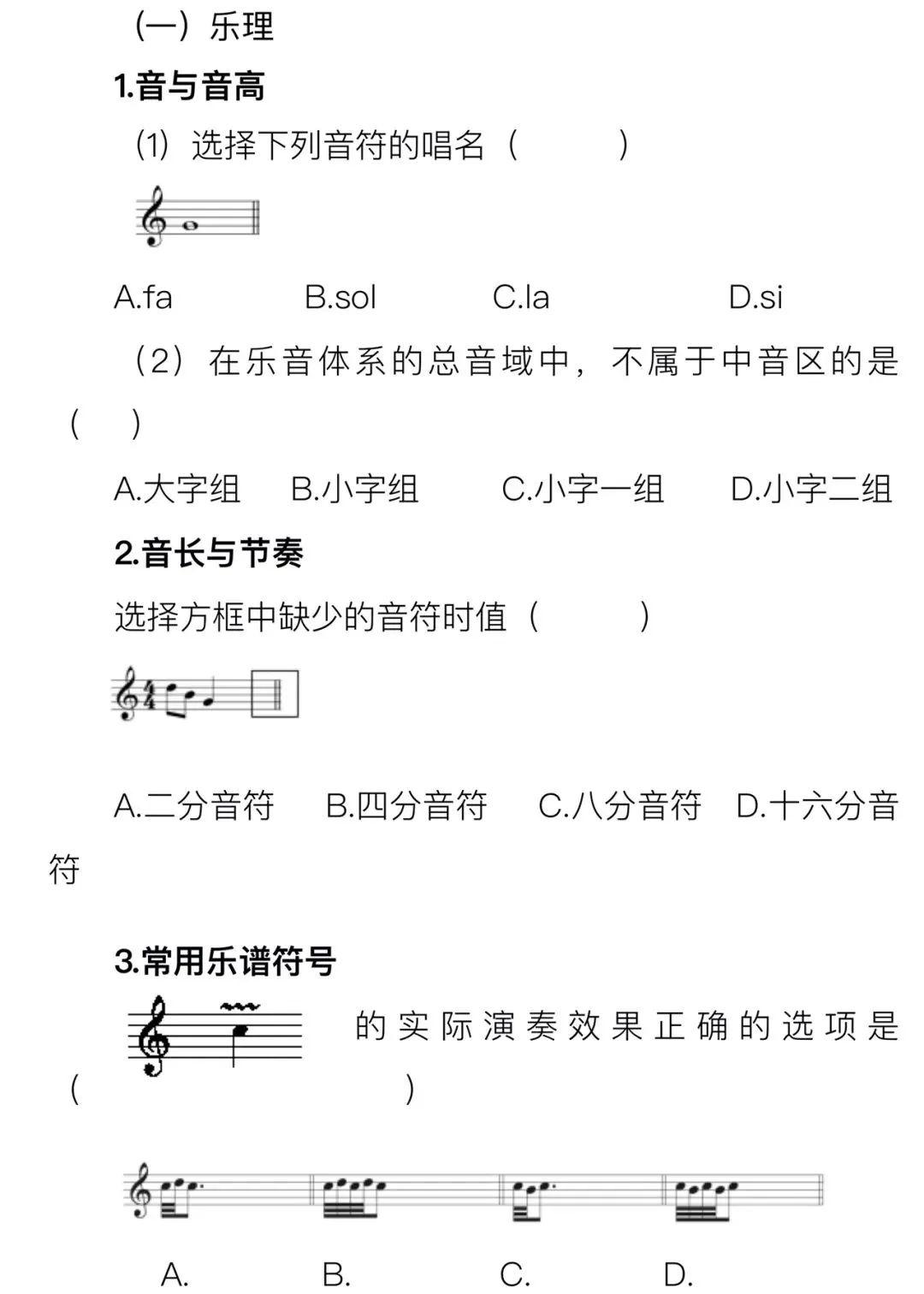 甘肃省普通高等学校招生音乐类专业统一考试是由合格的高中毕业生和具有同等学力的考生参加的选拔性考试,是考生进入高校相关专业学习应当具备的基本素质和能力测试,旨在考查考生对音乐的感知、理解和表现能力,其评价结果是高校相关专业招生录取的重要依据。音乐类专业省级统考分音乐表演、音乐教育两类,其中音乐表演类考试包括器乐、声乐两个方向,适用于音乐表演、流行音乐等专业;音乐教育类考试适用于音乐治疗、音乐教育等专业。音乐学等专业可根据招生院校要求,确定参照音乐表演或音乐教育类相关考试要求。考试包括乐理、听写、视唱、器乐、声乐五个科目。总分为300分,不同类别考试科目分值如下:考试包括乐理、听写、视唱、器乐四个科目,其中乐理15分、听写30分、视唱15分、器乐240分。考试包括乐理、听写、视唱、声乐四个科目,其中乐理15分、听写30分、视唱15分、声乐240分。考试包括乐理、听写、视唱、主项(声乐、器乐各选其一)、副项(声乐、器乐各选其一)五个科目,其中乐理15分、听写30分、视唱15分、主项165分、副项75分。主项选择声乐的考生,副项须选择器乐;主项选择器乐的考生,副项须选择声乐。1.考试目的:主要考查考生对音乐理论基础知识的掌握程度。2.考试内容:音与音高、音长与节奏、常用乐谱符号、音程与和弦、民族调式与大小调式。1.考试目的:主要考查考生的音乐听辨能力与记忆力。2.考试内容:单音;旋律音组:三音组、五音组;旋律音程与和声音程:八度内(含八度)自然音程;和弦:四种三和弦、七和弦原位、转位;节奏:6小节左右;单声部旋律:高音谱表;8小节;调号为一升或一降;音域为f-a2以内。3.考试形式:采取笔试或机试方式,使用五线谱记谱,提供标准音a1参照。1.考试目的:主要考查考生的识谱能力,音准、节奏与速度的控制能力,以及音乐表现力。2.考试内容:五线谱视唱;1条8小节旋律;调号为一升或一降;音域为b-e2以内。3.考试形式:开始前提供标准音a1,考生一遍完成视唱。视唱过程中无任何音响提示。1.考试目的:主要考查考生乐器演奏技巧和能力,以及对音乐作品的理解力和表现力。2.考试内容:音乐表演或音乐教育以器乐作为主项时演奏作品2首(练习曲1首,乐曲1首),总时长不超过8分钟,考生报考时填报练习曲1首,乐曲2首(现场随机抽考1首)。音乐教育以器乐作为副项时演奏乐曲1首,总时长不超过4分钟。(1)中西打击乐原则上要求演奏两种不同打击乐器的作品各1首,其中一种为音高类打击乐器;钢琴必须包含复调乐曲1首。(3)考试过程中主考有权要求考生从乐曲的某处开始或结束。1.考试目的:主要考查考生的嗓音条件、演唱水平及对音乐作品的理解力和表现力。2.考试内容:音乐表演或音乐教育以声乐作为主项时演唱声乐作品2首,总时长不超过6分钟。音乐教育以声乐作为副项时演唱声乐作品1首,总时长不超过3分钟。(2)声乐分美声唱法、民族唱法、通俗唱法、原生态唱法四种,曲目自选。(3)考试过程中主考有权要求考生从歌曲的某处开始或结束。(4)在考生演唱前只给出歌曲第一乐句的调高速度提示。(考生在参加声乐考试时须提前准备所演唱歌曲的第一乐句乐谱,简谱、五线谱均可,并标明适合自己所演唱的准确调高。如歌曲中间有间奏引导的转调,一并提供乐谱并注明所转调高,以便钢琴引导)。(一)听写、视唱考查的拍号范围:2/4、3/4、4/4、6/8拍;(二)听写、视唱考查的节奏型范围:采用基本节奏型,不出现跨拍、跨小节切分节奏,不出现32分音符。