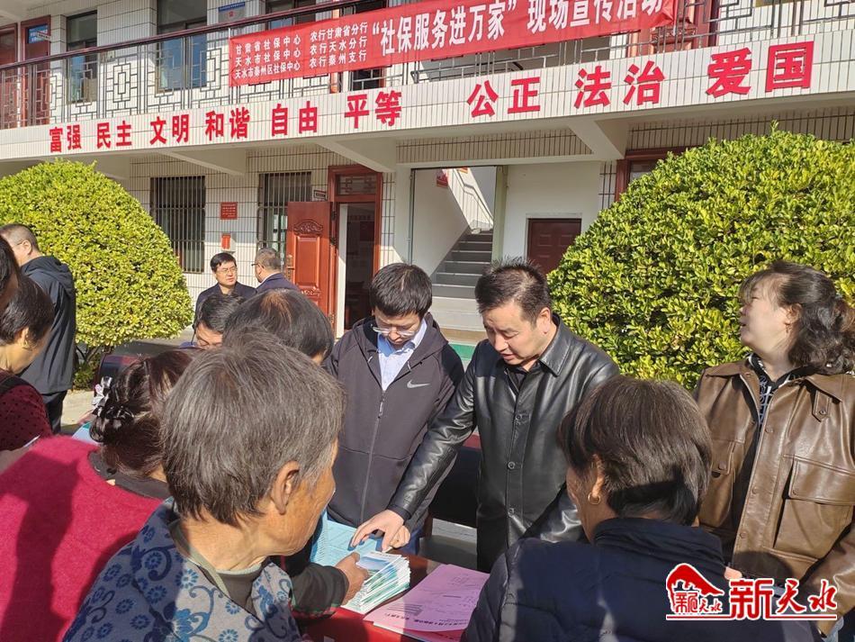 新天水讯 10月26日,秦州区人社局走进秦州区皂郊镇贾家寺村,开展以“社保服务进万家—全民参保 共享美好”为主题的进乡村活动。