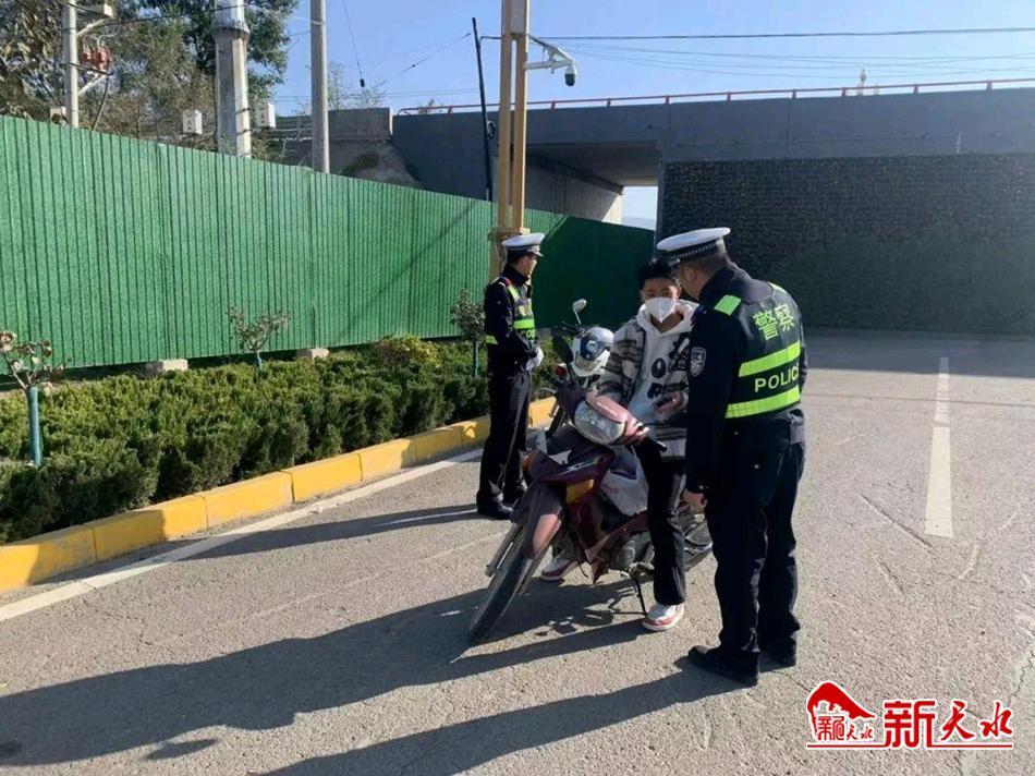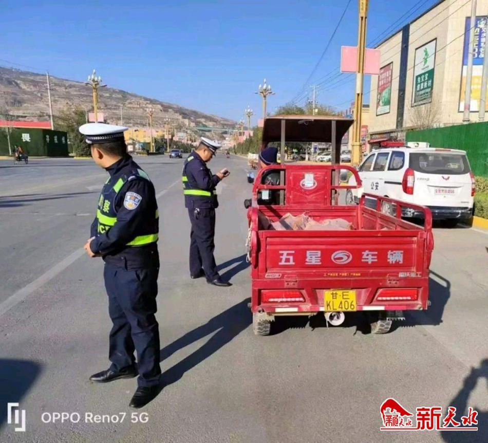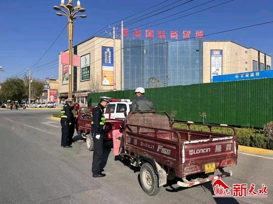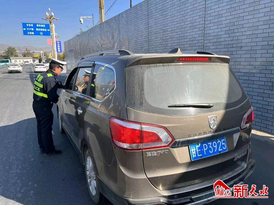 新天水讯 11月6日,秦安县公安局交警大队持续在辖区开展“一盔一带”安全守护行动,进一步引导群众自觉养成驾乘车辆“戴好安全头盔”“系好安全带”的良好行为习惯,助推人民群众养成安全、文明的出行习惯,确保交通安全。