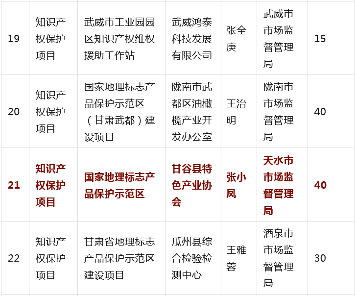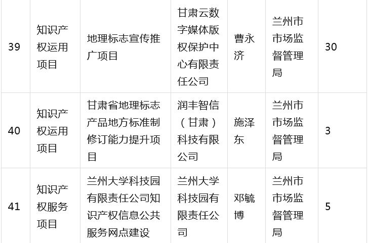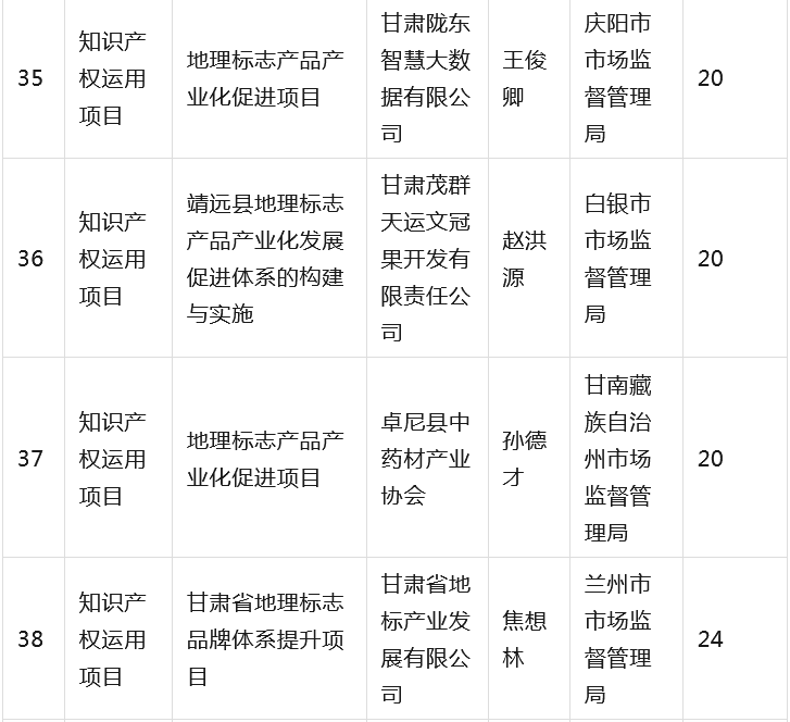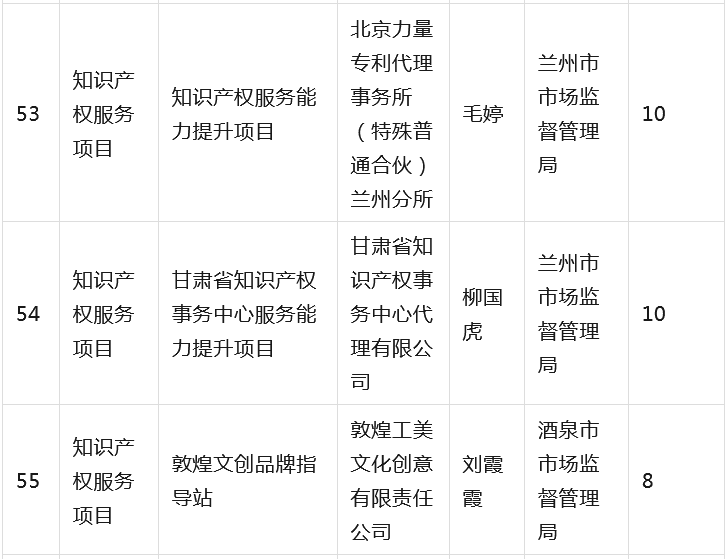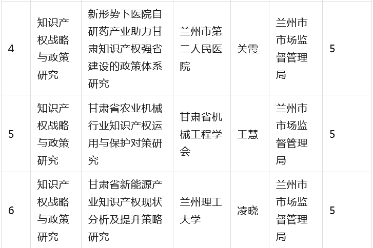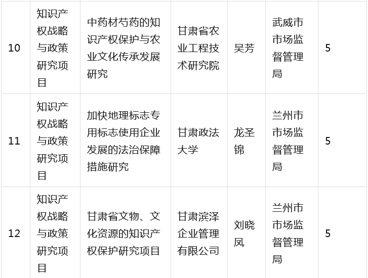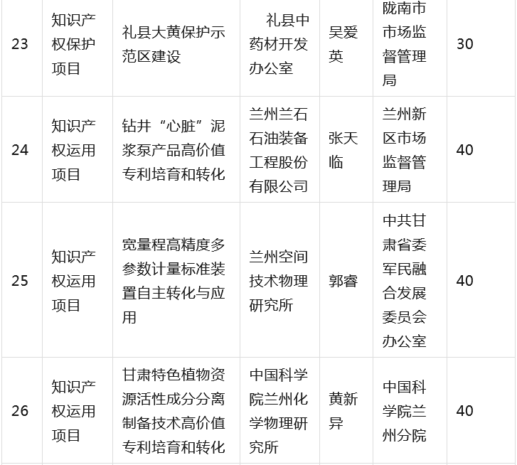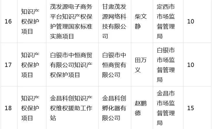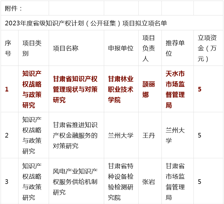 为全面贯彻落实省委省政府有关知识产权工作的决策部署,深入推进知识产权强省建设,根据《甘肃省知识产权计划项目管理办法》《甘肃省知识产权计划项目公开公示办法》等有关规定,省市场监管局组织开展2023年度甘肃省知识产权计划项目工作,经公开征集申报、市(州)初审推荐、专家综合评审、现场核验等程序,提出了《2023年度省级知识产权计划(公开征集)项目拟立项名单》,并经省局第31次党组(扩大)会议审议通过,现予以公示(名单见附件),欢迎社会各界监督。