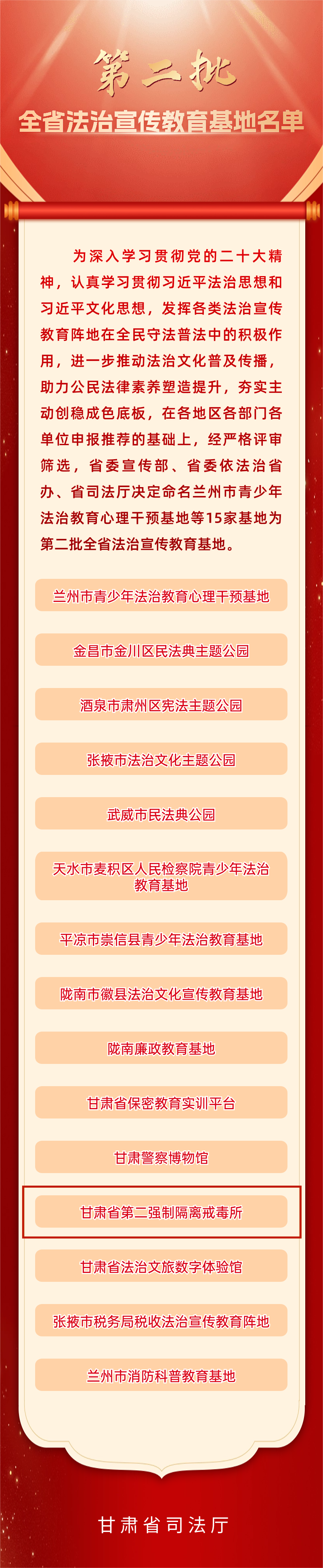 附 甘肃省第二批全省法治宣传教育基地名单: