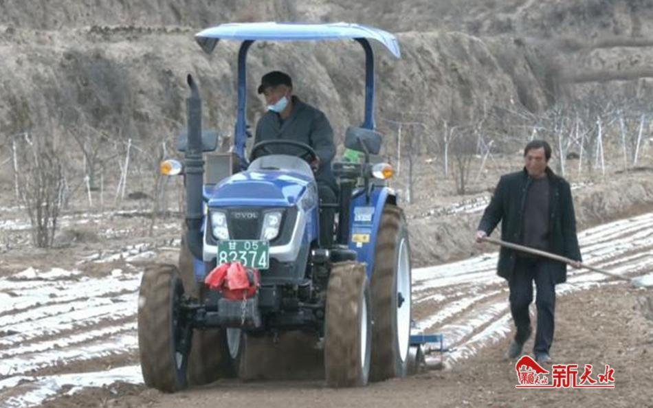 新天水讯【通讯员何乐 刘亮】机械施肥、机械铺膜。连日来,在甘谷县的山川沟梁,到处可见县乡干部、专业技术人员与群众一起抢时间、抢墒情、挥锹扬镐、整地施肥、覆盖地膜的繁忙景象。一台台覆膜机在田间往返穿梭,一垄垄覆好的地膜为农田“穿”上闪亮的“冬”装,形成了一道独特的冬日乡村风景图。