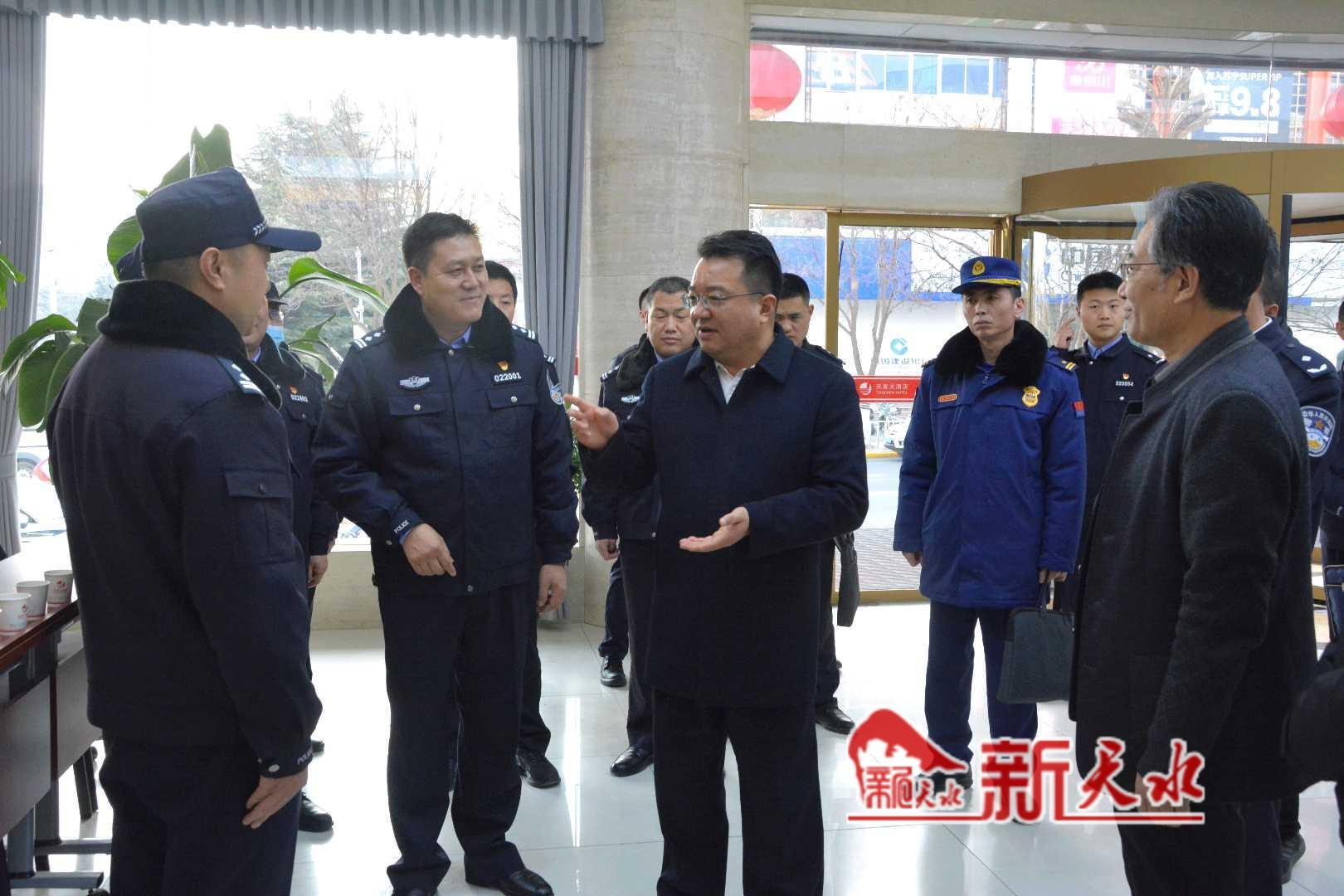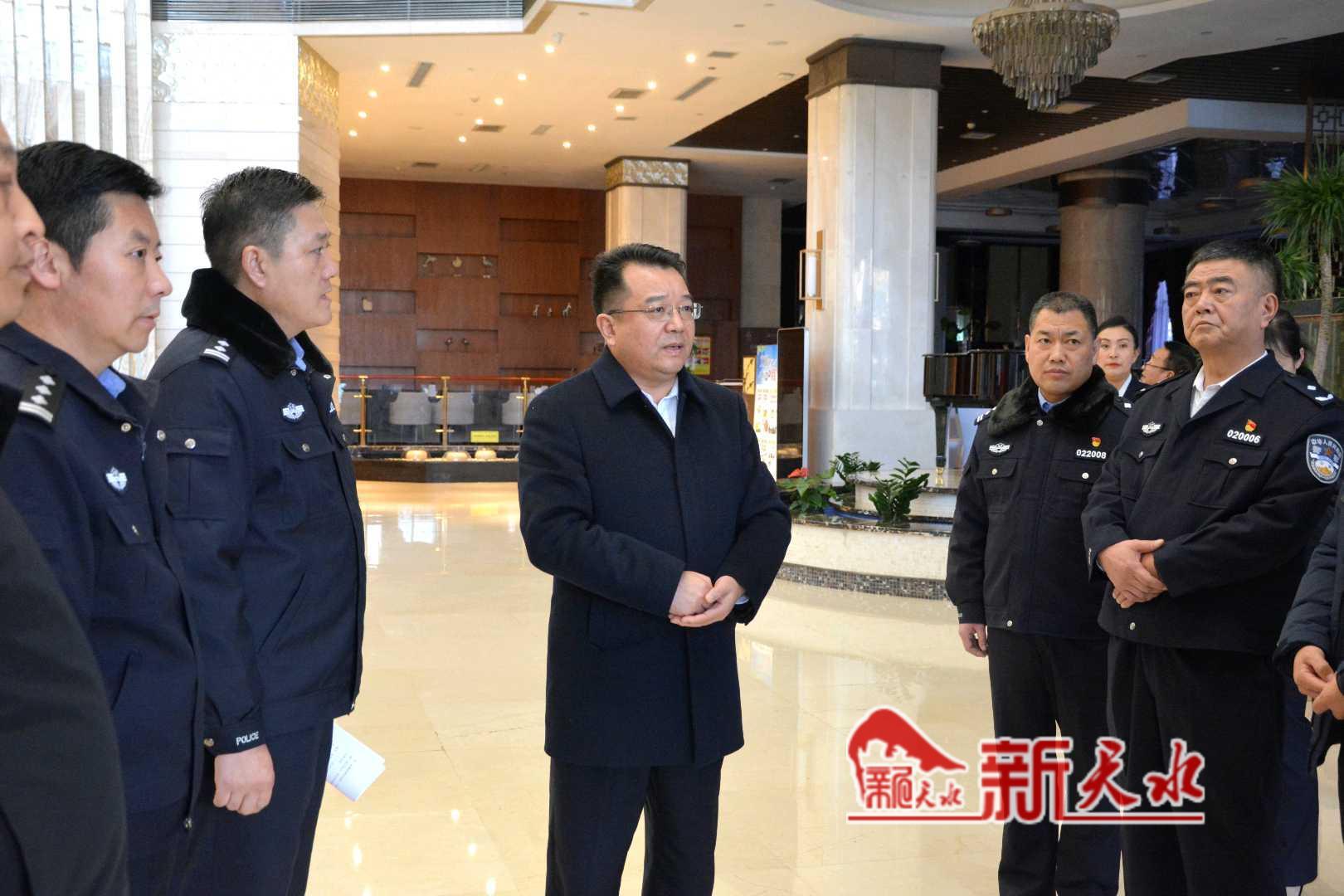 新天水讯【记者马凯】12月20日下午,副市长、市公安局局长郭庆祥带领公安、应急、市场监管、信访、消防救援等部门负责同志,到“两会”主场地天水宾馆、天辰大酒店、秦州大剧院检查指导安保工作。