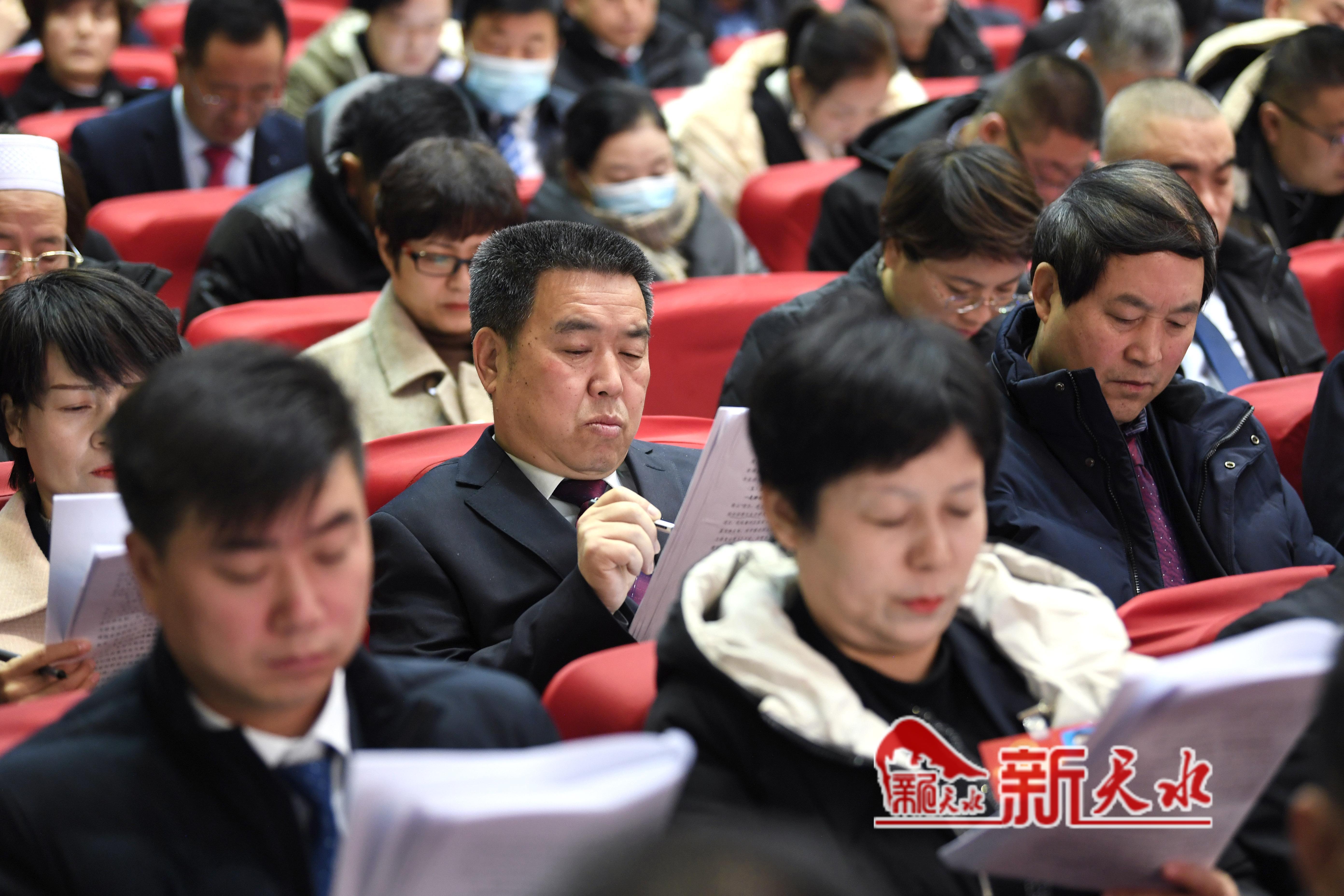秦州剧院内气氛庄重热烈,主席台帷幕正中的国徽在鲜艳的红旗映衬下熠熠生辉。会场内悬挂着“以习近平新时代中国特色社会主义思想为指导,为谱写中国式现代化天水新篇章而努力奋斗!”的横幅标语鼓舞人心、催人奋进。