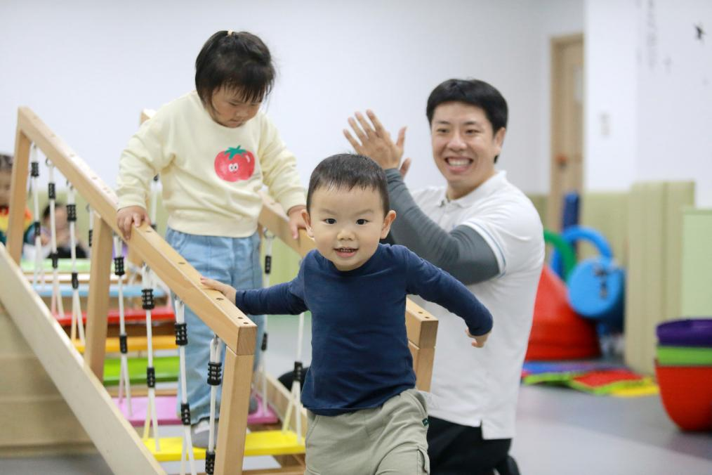 2023年10月29日,在江苏省扬州市一家科技综合体托育中心,小朋友在托育老师的陪伴下玩乐。新华社发(孟德龙 摄)