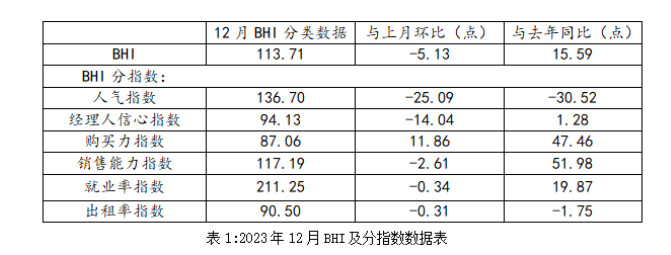 日前,商务部流通业发展司立项、中国建筑材料流通协会编制并发布的全国建材家居景气指数显示,2023年12月份BHI 为113.71,环比下跌5.13点,同比下跌15.59点。全国规模以上建材家居卖场12月销售额为1290.82亿元,环比下跌2.17%,同比上涨79.72%;2023年全年累计销售额为15505.39亿元,同比上涨33.54%。