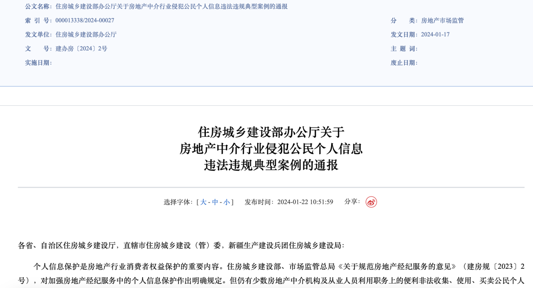 1月22日上午,住建部官网通报了5起房地产中介行业侵犯公民个人信息违法违规典型案例: