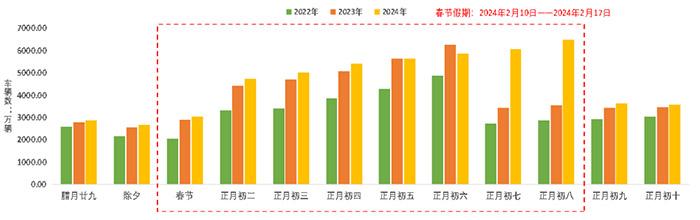预计春节期间(含除夕),普通公路日均断面交通量约7800辆,同比2023年增长约8.2%。相较于高速公路,普通公路在春节期间流量较为平稳,没有显著高峰,在节前明显下降,除夕达到最低值,初三以后交通量有所回升。
