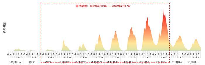 此外,春节期间出程与节日后期返程的潮汐特征明显,9-12时和14-19时为易发生拥堵时段。