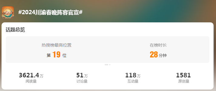 重庆广播电视集团(总台)与四川广播电视台继续携手打造2024川渝春晚,拟于2月8日(腊月二十九)在重庆卫视、四川卫视同步播出。2024川渝春晚运用数字虚拟合成拍摄技术、AR现实增强技术推出5G云合唱的创新;围绕长江文化创作交响诗,将川渝两地共住长江边的壮丽美好情怀淋漓呈现;巧妙地将舞台搬进“高铁”,多样化、传统与时尚结合的舞台,艺术化描摹川渝的腾飞画卷,将为观众带来一场热闹、喜庆、火辣的川渝春晚。