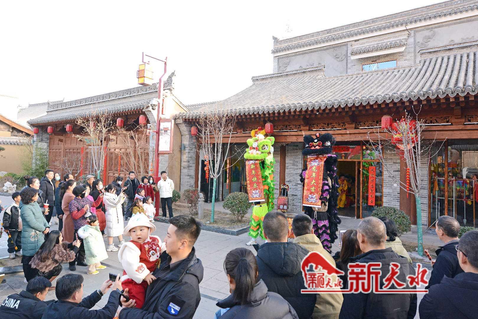 春节期间,市民在天水古城观看舞狮表演。