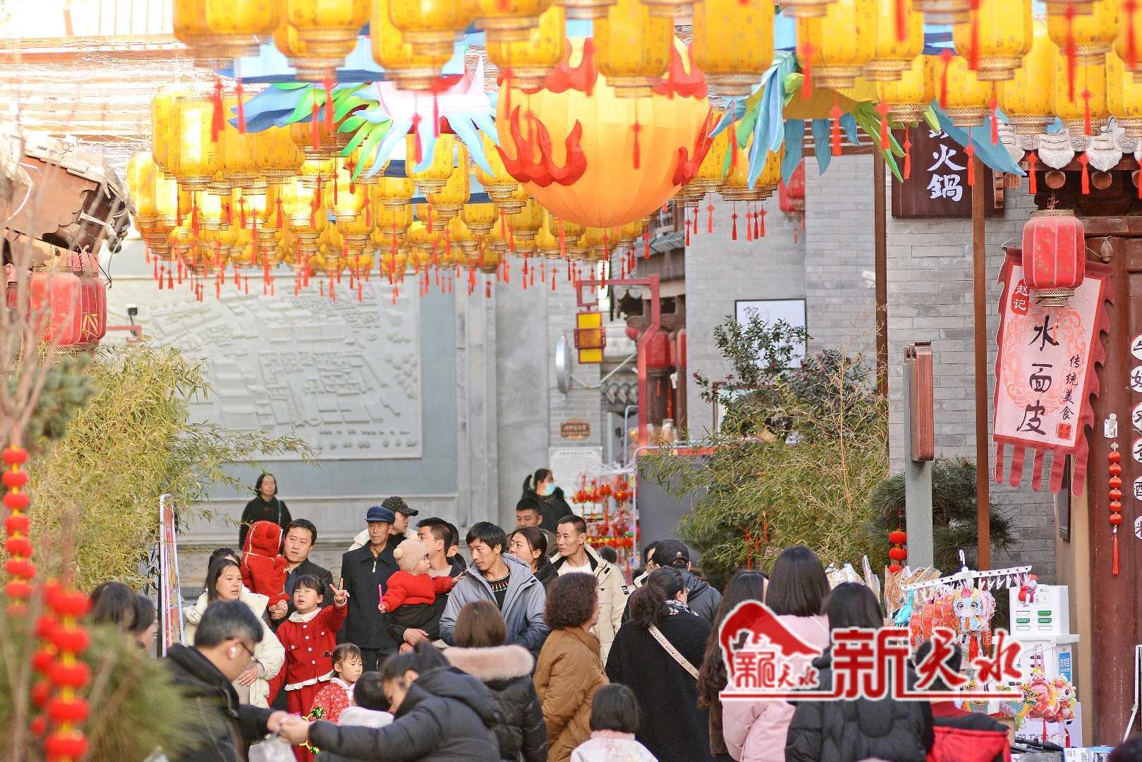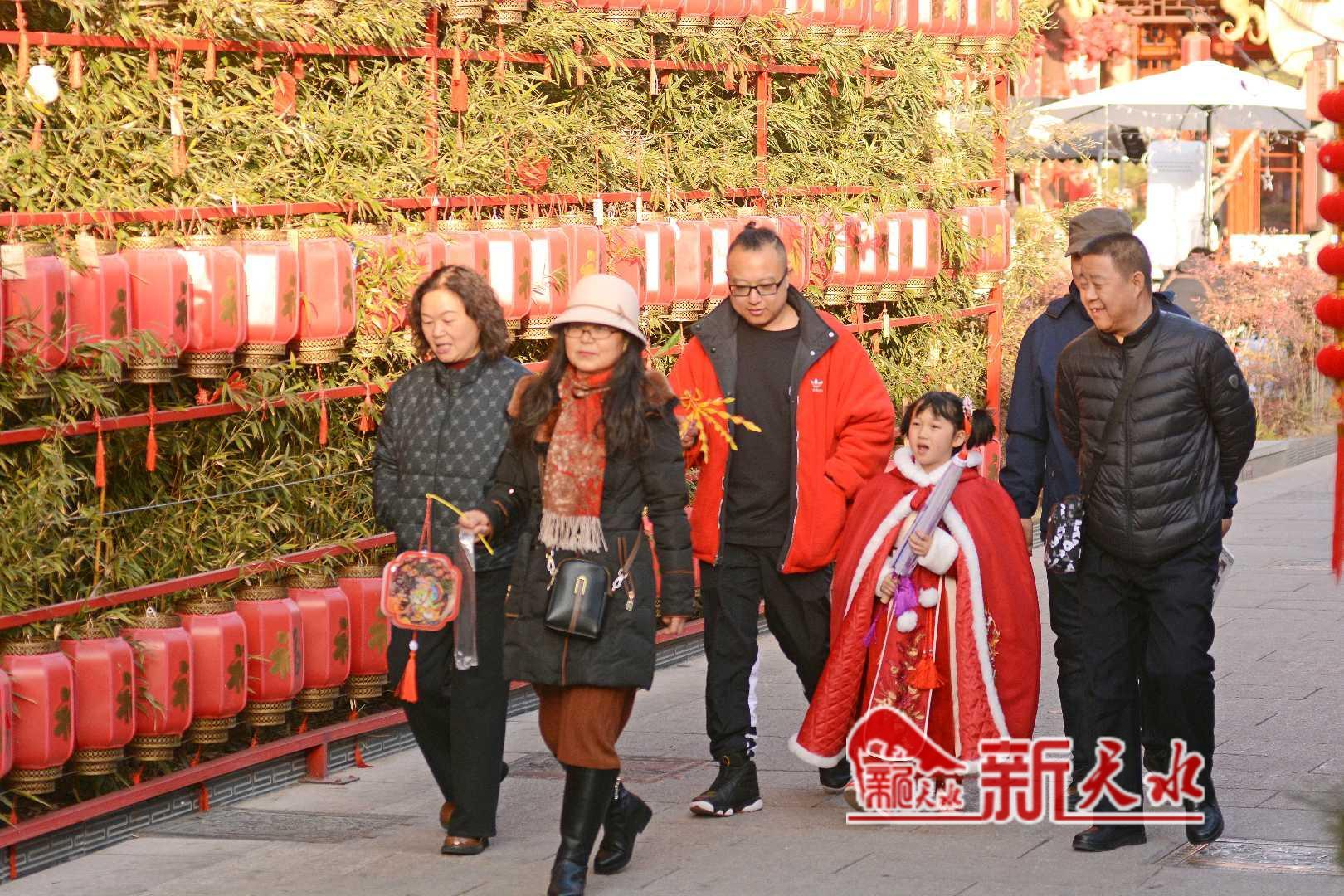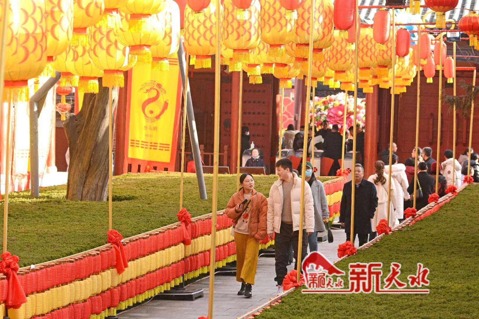春节期间,游客和市民走进天水伏羲城和天水古城, 赏花灯、看舞狮,乐享新春佳节。图为伏羲城张灯结彩,人们洋溢着快乐的笑容。