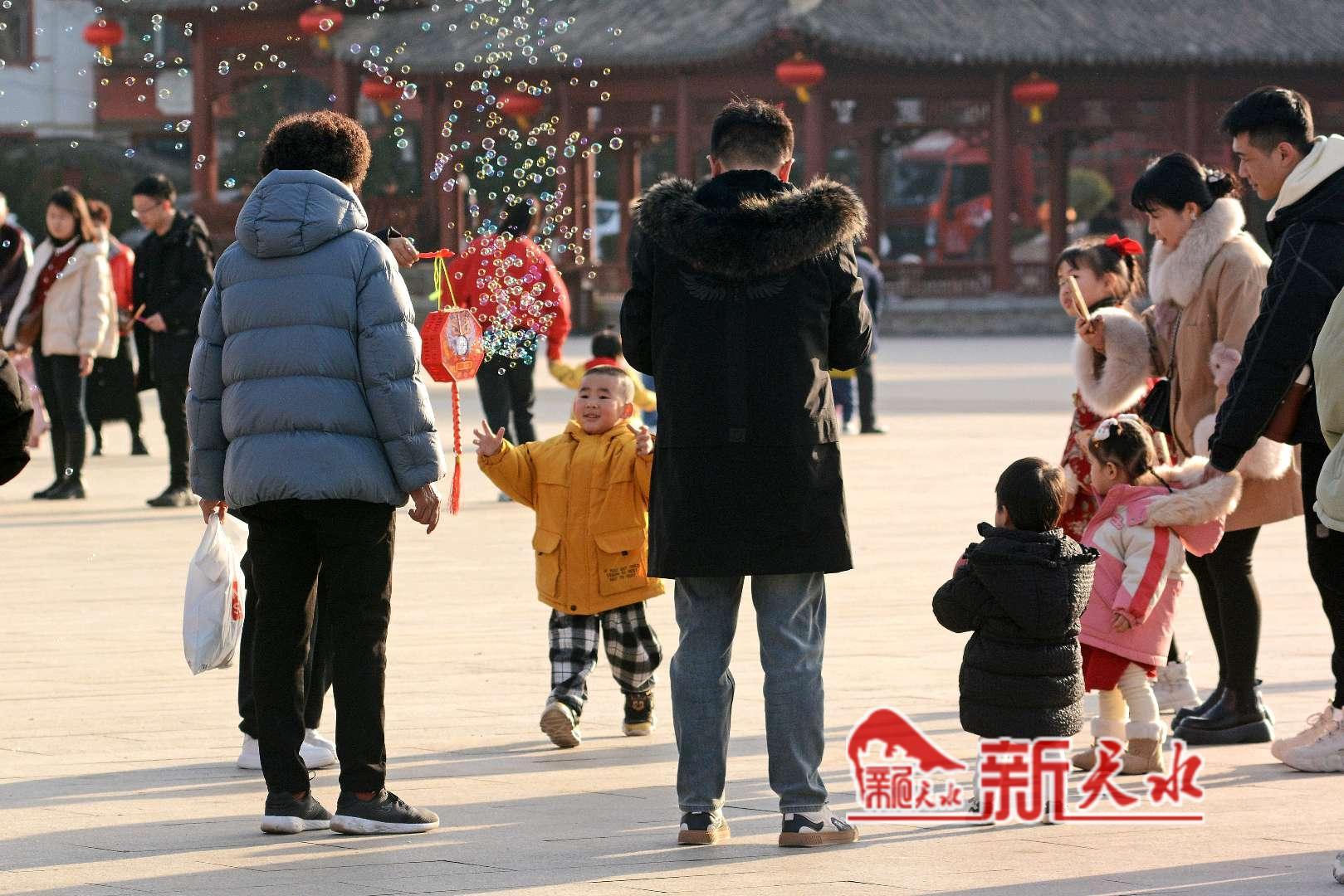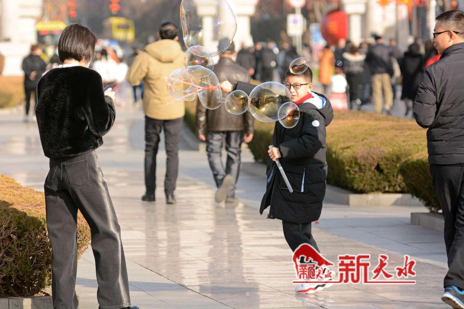 春节期间,孩子们在伏羲城玩着吹泡泡的游戏。