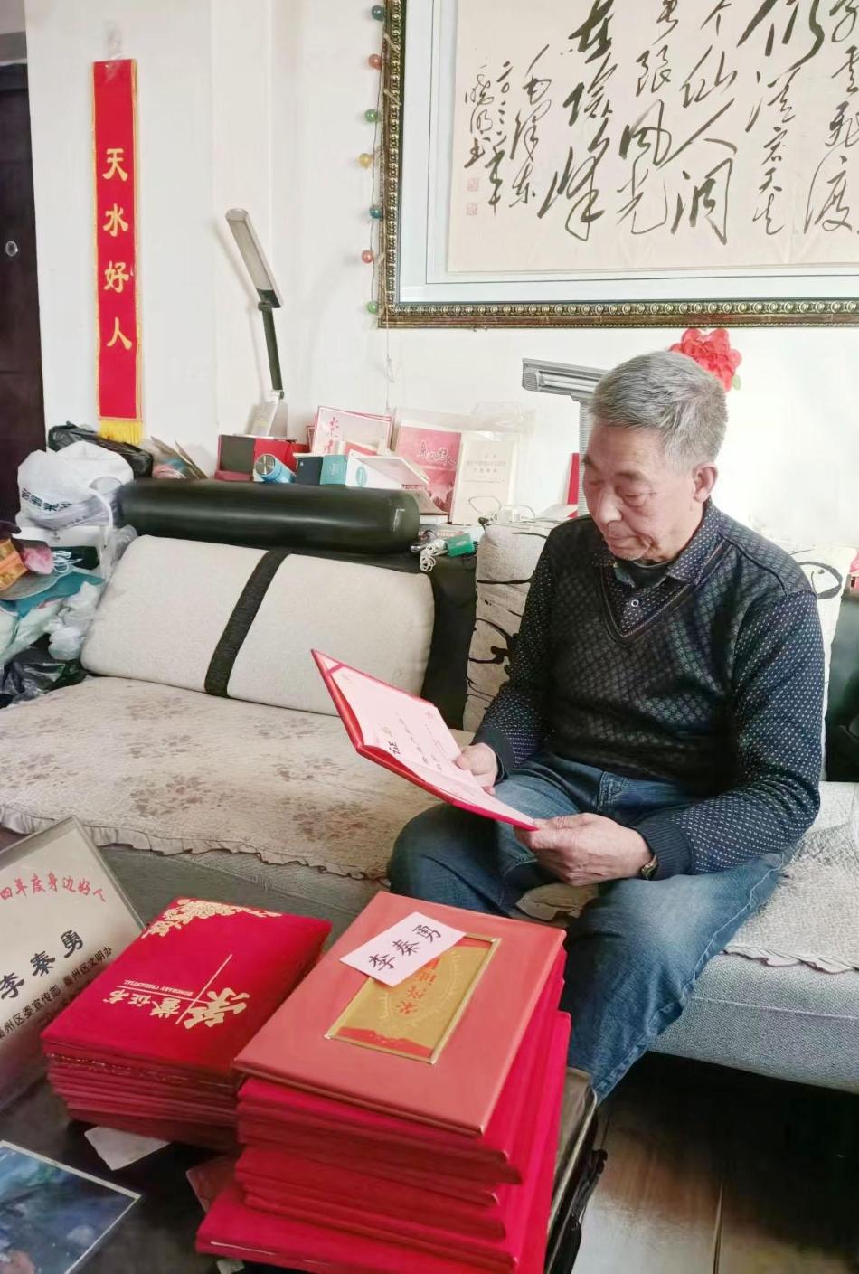 在一圈巡视结束后,记者和李秦勇老人一起来到他家。一进门,记者的目光就被沙发上摆放的一摞摞荣誉证书锁定了。翻看之后,记者发现这些证书有的是街道社区发放的“优秀巡防员”“优秀志愿者”“优秀党员”证书,还有天水市文明办颁发的“2020年第三季度‘天水好人’”证书等等,而沙发一侧的墙上挂着的全家福更是让人感受到了李秦勇老人温馨的家庭氛围。