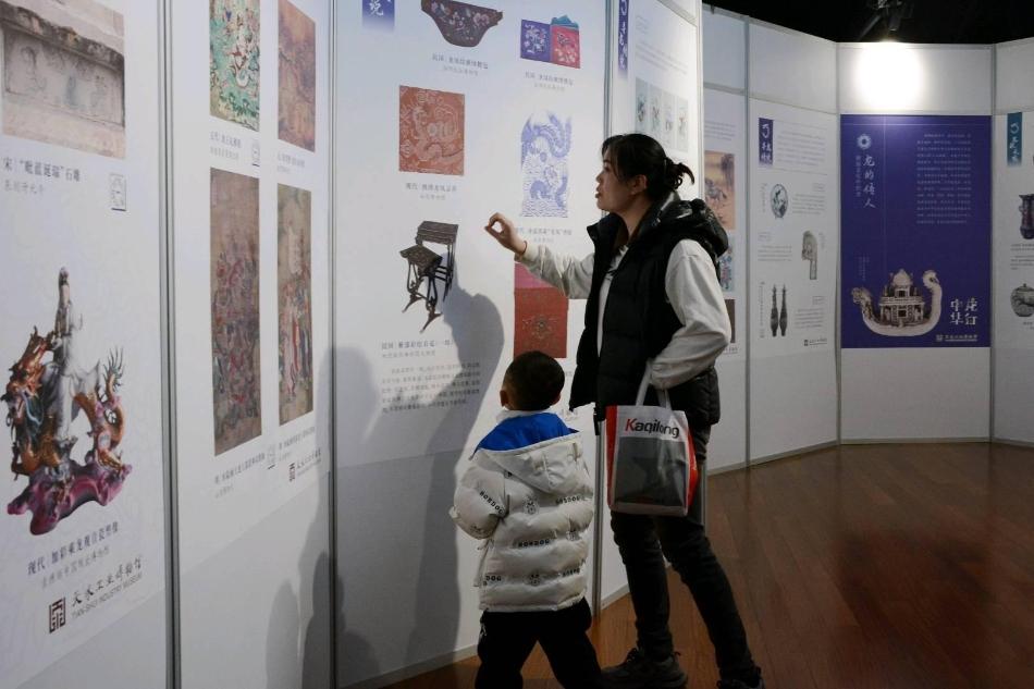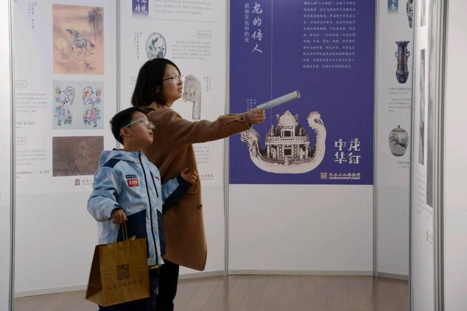 “中国民间有一种传说:一龙生九子,九子各不同。”站在“中国龙的形象构成示意图”前,市民李毓娟正在给儿子余宸介绍着中国龙文化。