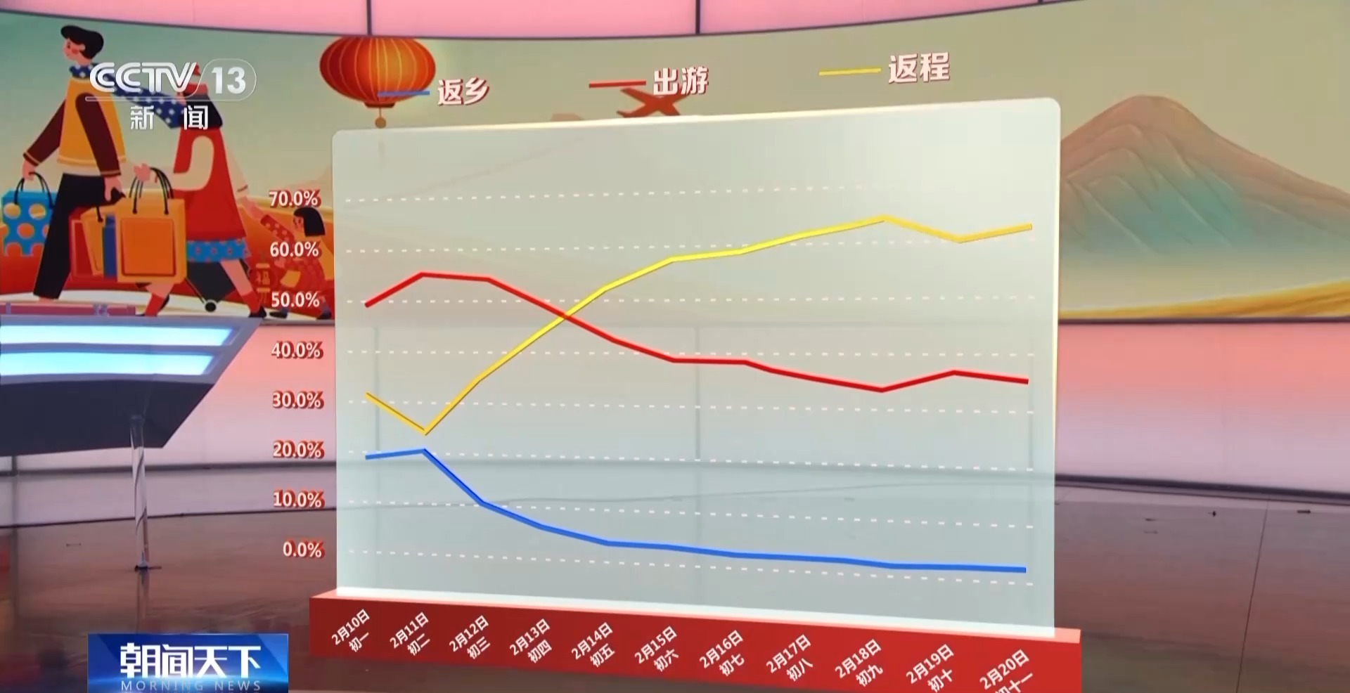 如果把人流分为返程、出游和返乡等类型,我们看到,而出游的人群从初一开始占据了更大的比例,一直到初五,返程才超过出游成为占比最高的人群,并逐渐上升。整体上看,返程客流占客流总量的比例,从初二的约四分之一上升到现在的六成以上。