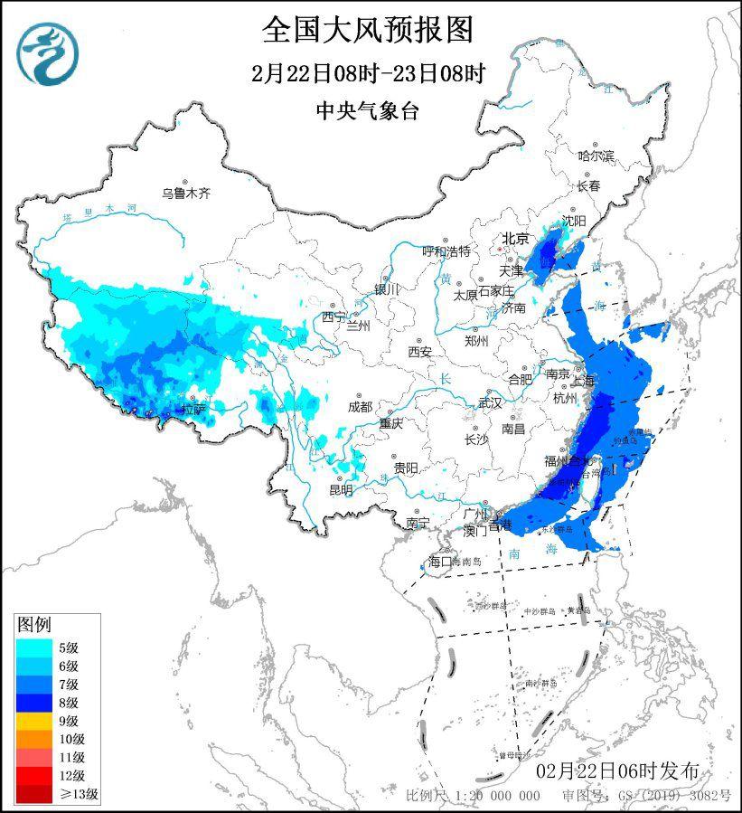 中央气象台2月22日6时继续发布大风蓝色预警:预计,2月22日8时至23日8时,西藏中西部、青海西南部、辽东半岛、云南东部等地的部分地区有5~6级大风,阵风7~8级;渤海、渤海海峡、黄海西部海域、东海西部海域、台湾海峡、台湾以东洋面、南海东北部将有7-8级、阵风9级的偏北到东北风。