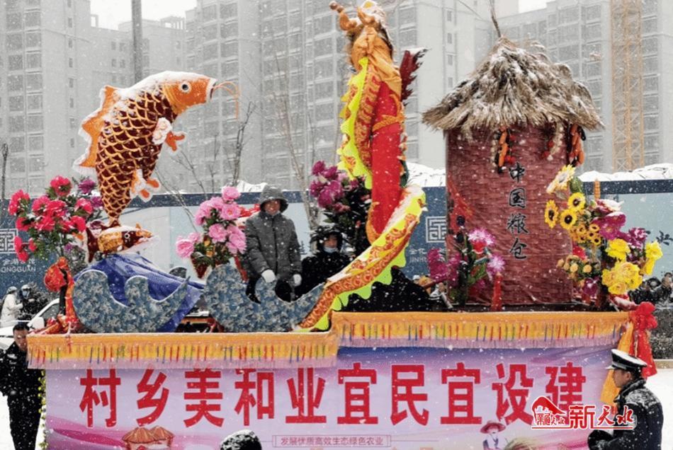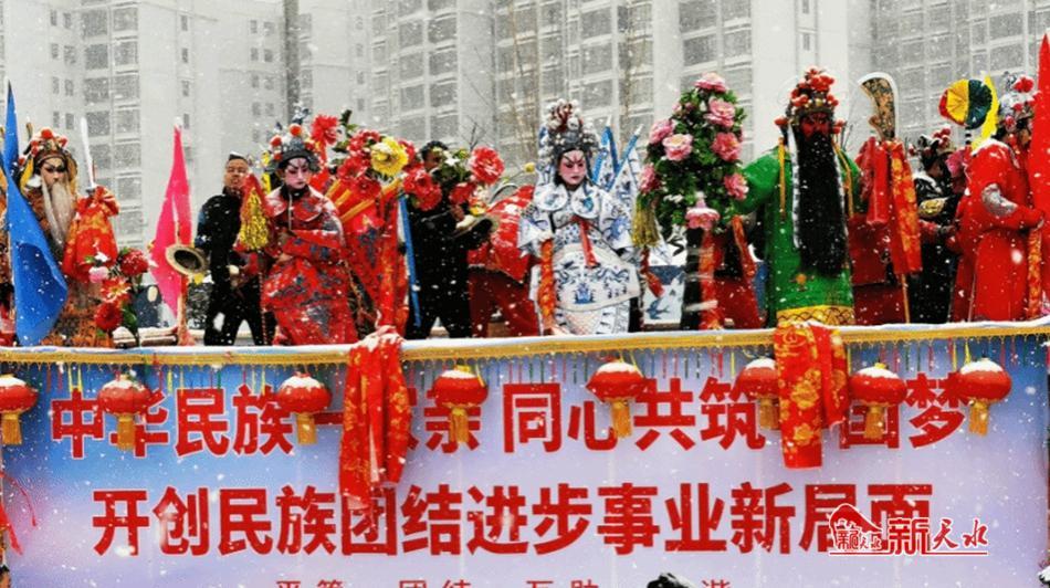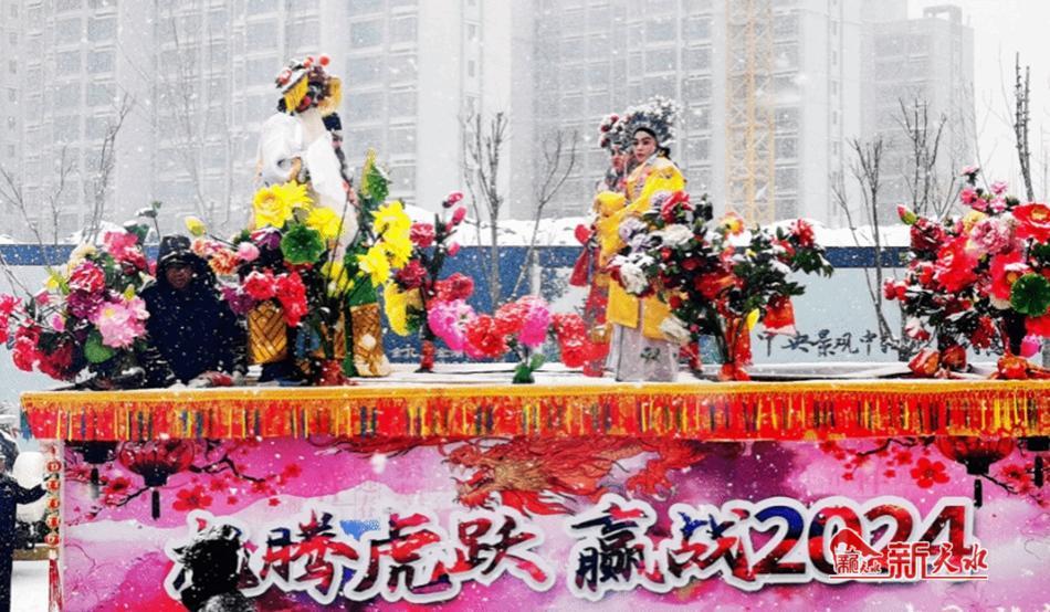 当日,秦水大道彩旗飘扬、锣鼓喧天、鞭炮齐鸣,迟迟而至的风雪为节日的盛宴增添了烂漫的色彩,道路两边人头攒动,喝彩声、掌声、呐喊声此起彼伏、不绝于耳,呈现出一派欢乐、祥和的氛围,热热闹闹地把浓浓的龙年喜庆气氛推向了高潮。从秦水大道到阿阳大道,各乡镇社火队踏着喜庆的鼓点、和着欢快的节拍相继登场表演,给广大群众带来了一场极具特色的视觉盛宴。