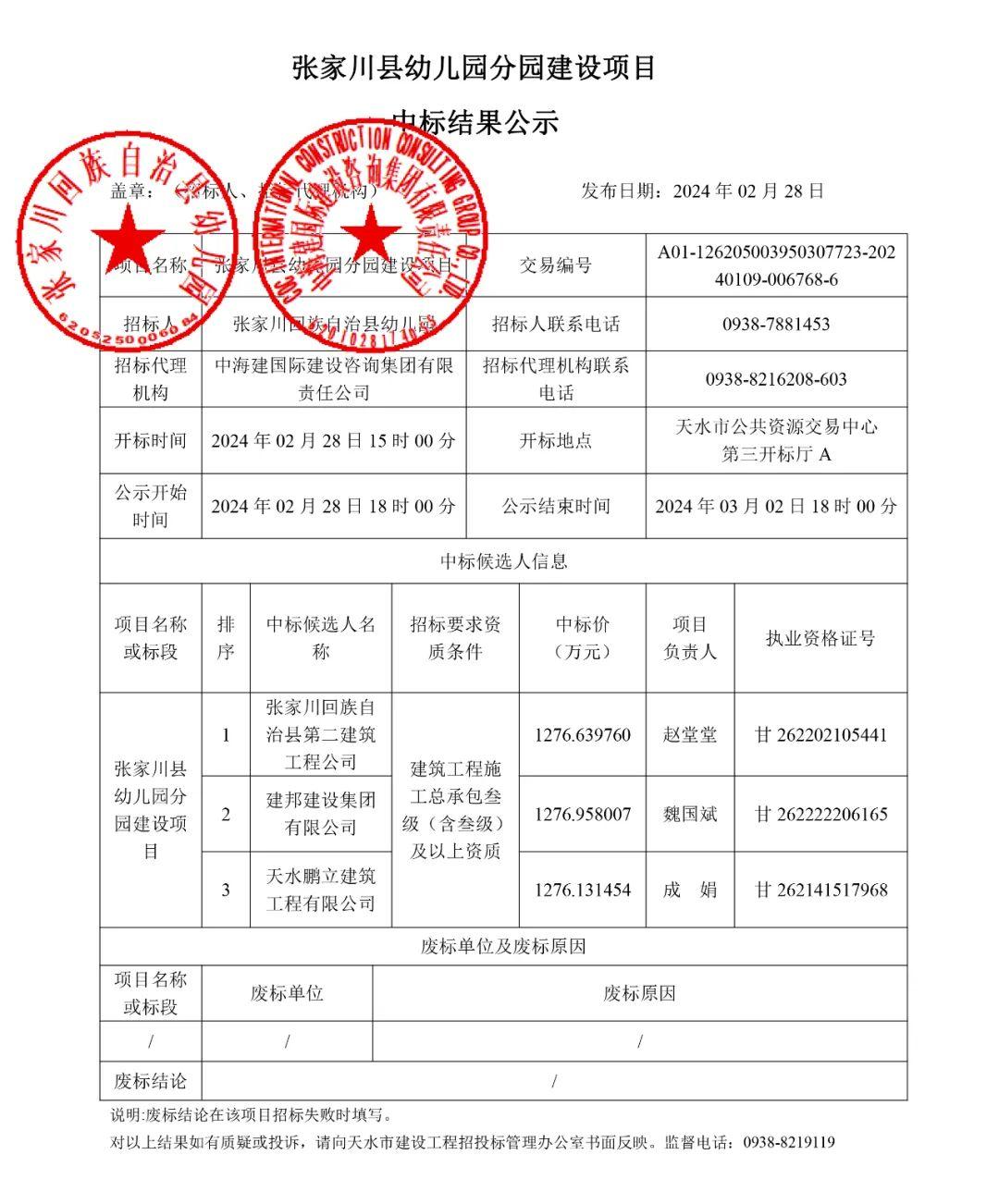 2024年2月28日,天水市公共资源交易中心发布“张家川县幼儿园分园建设项目中标结果公示”,具体内容如下: