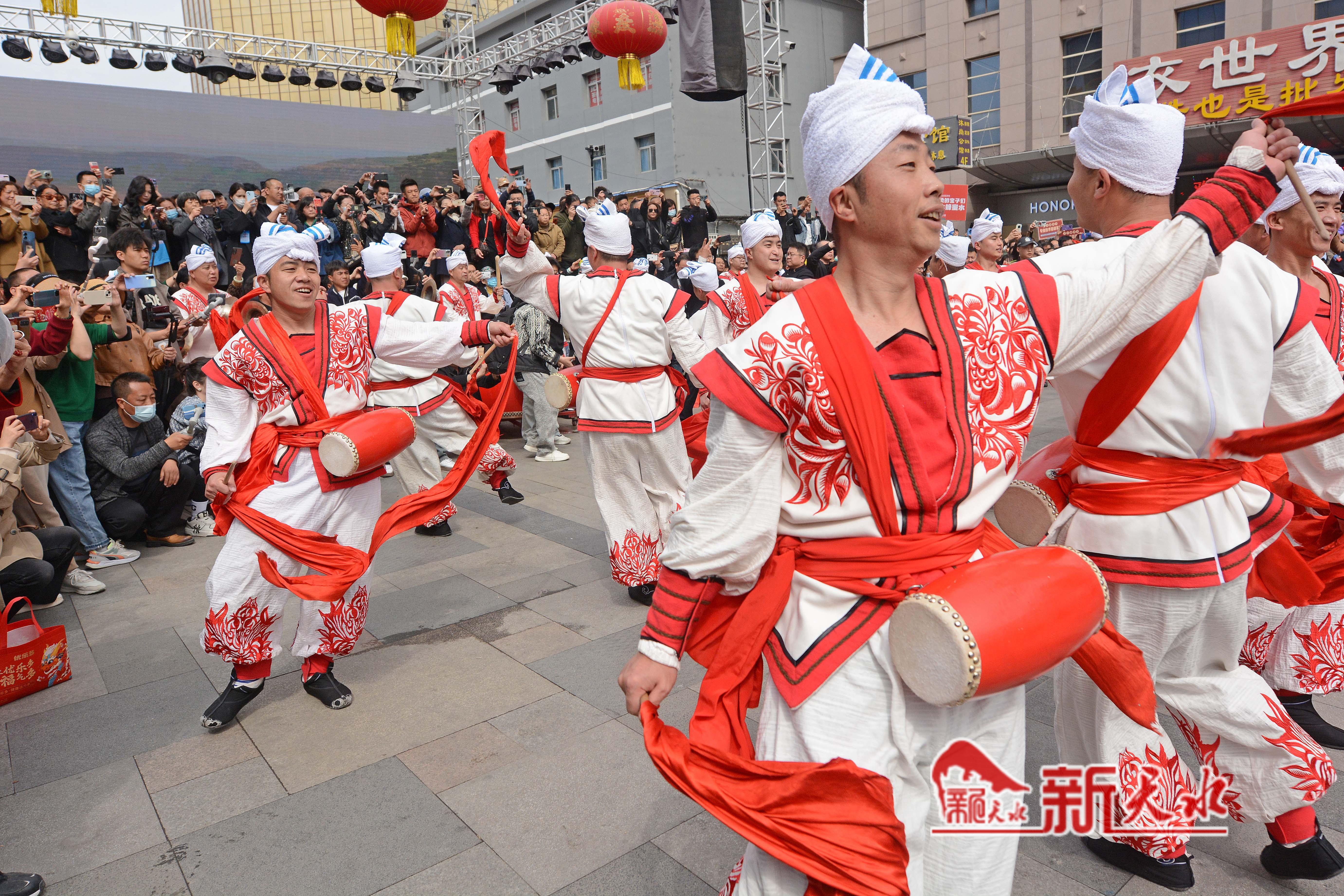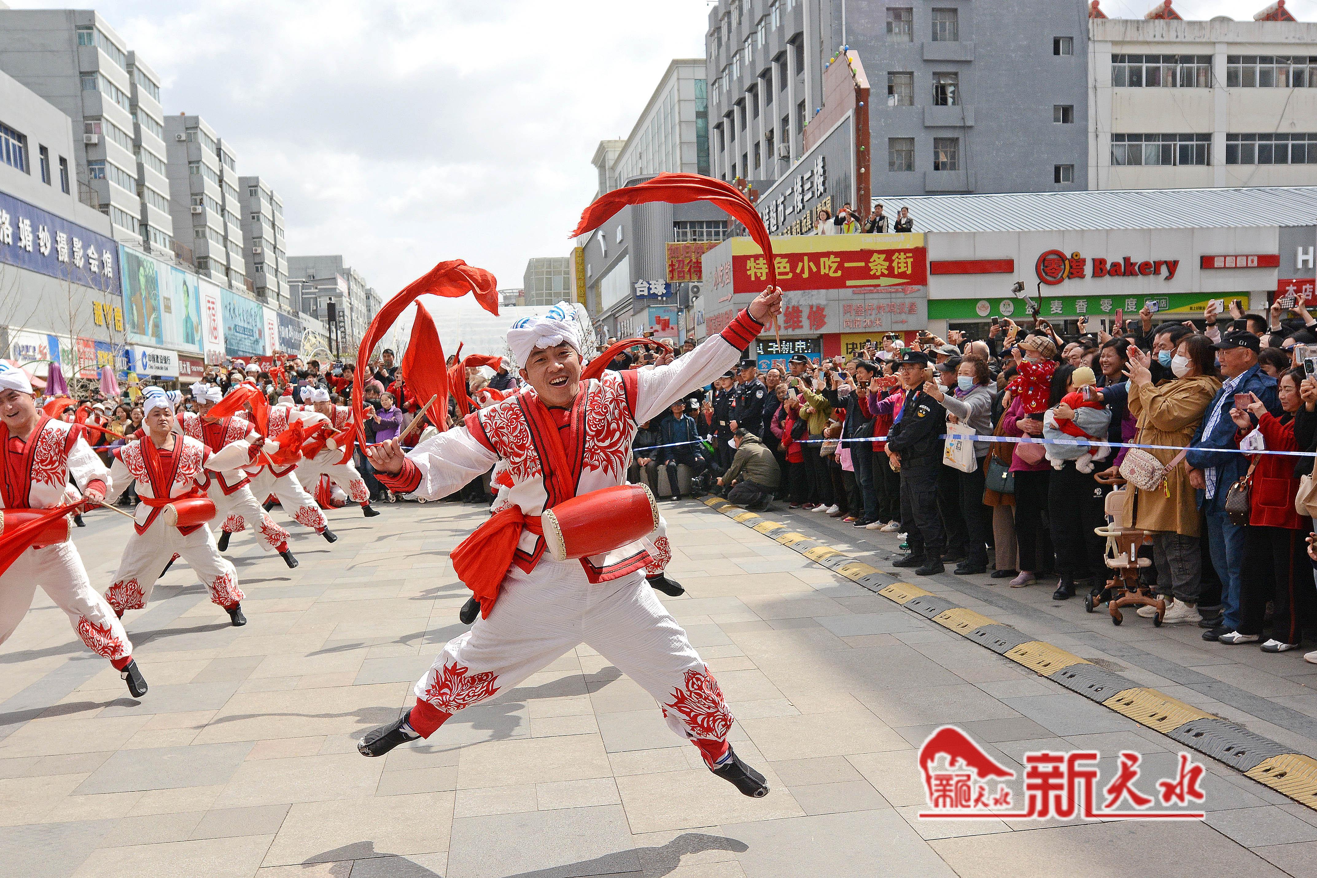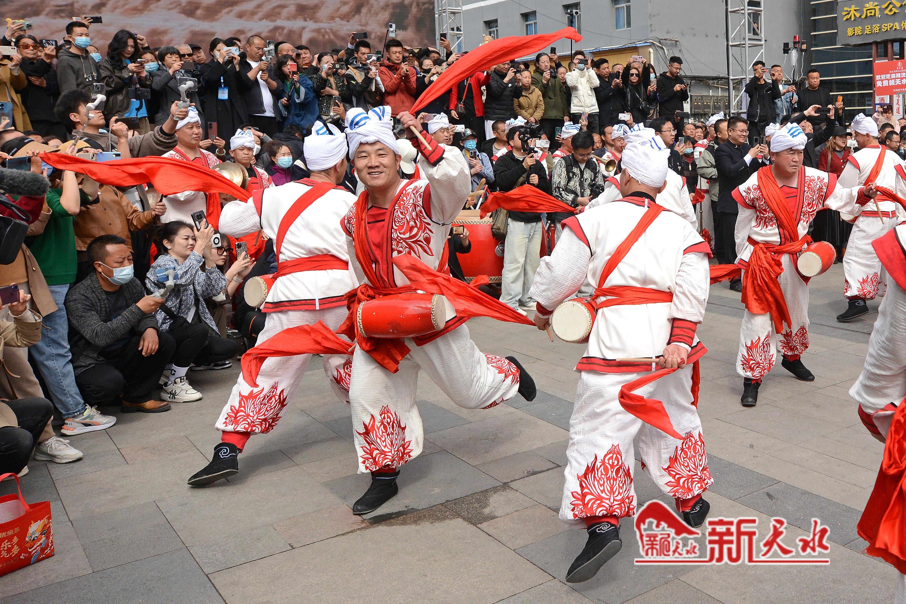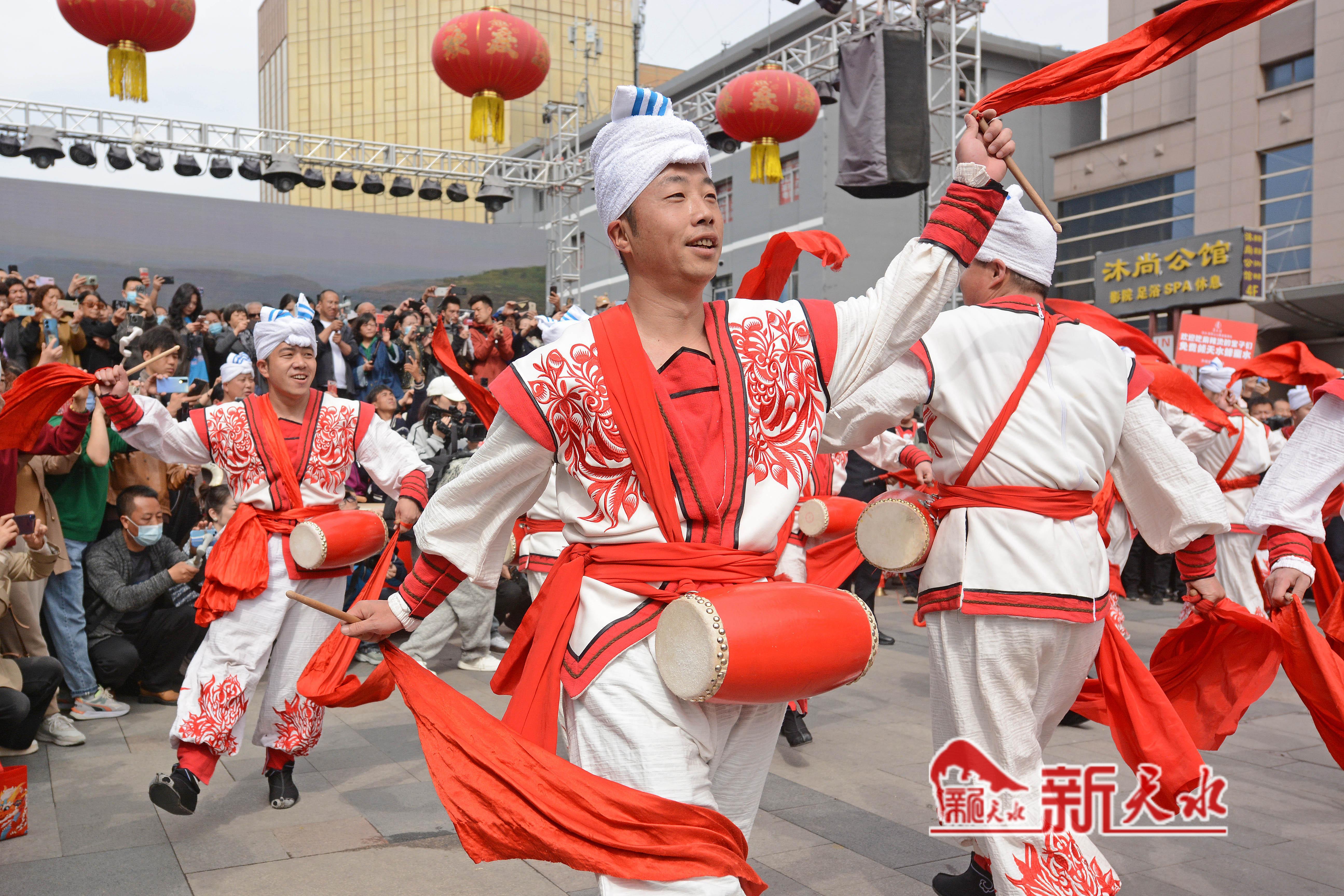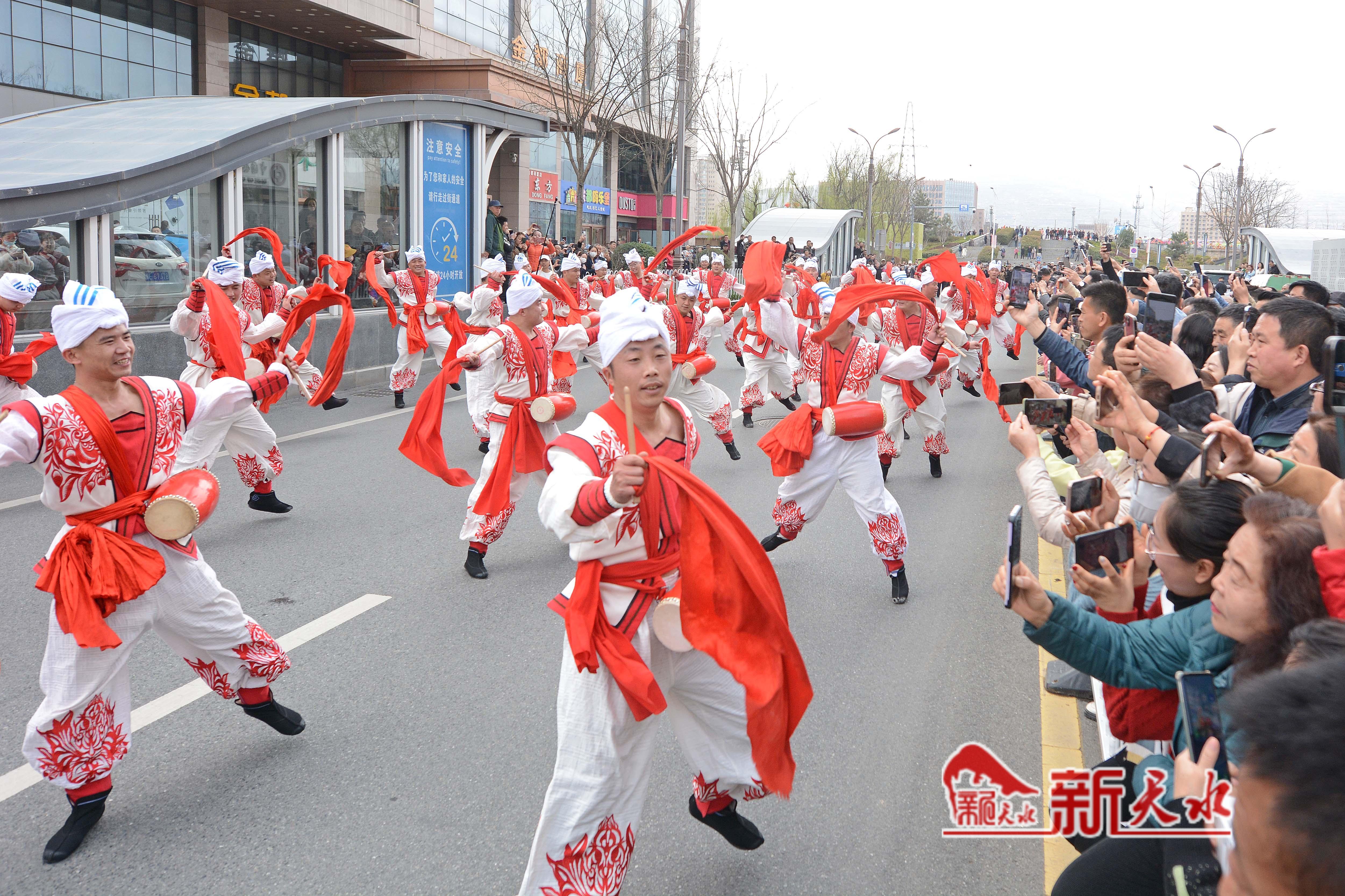 3月27日,陕西省榆林市横山老腰鼓表演队在天水市秦州、麦积两区“激情鼓舞”,为天水麻辣烫鼓劲加油,体现陕甘一家亲的深情厚意。