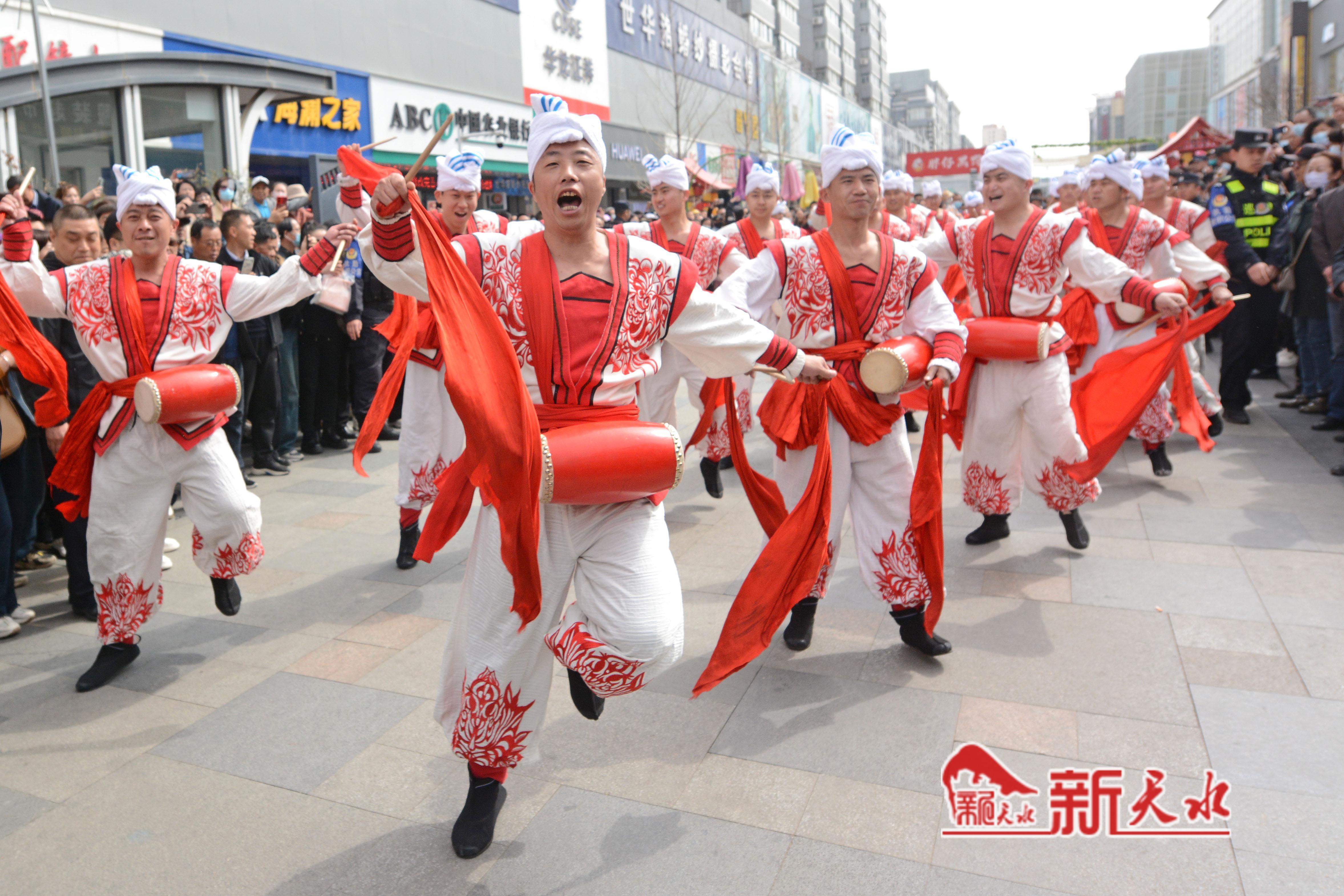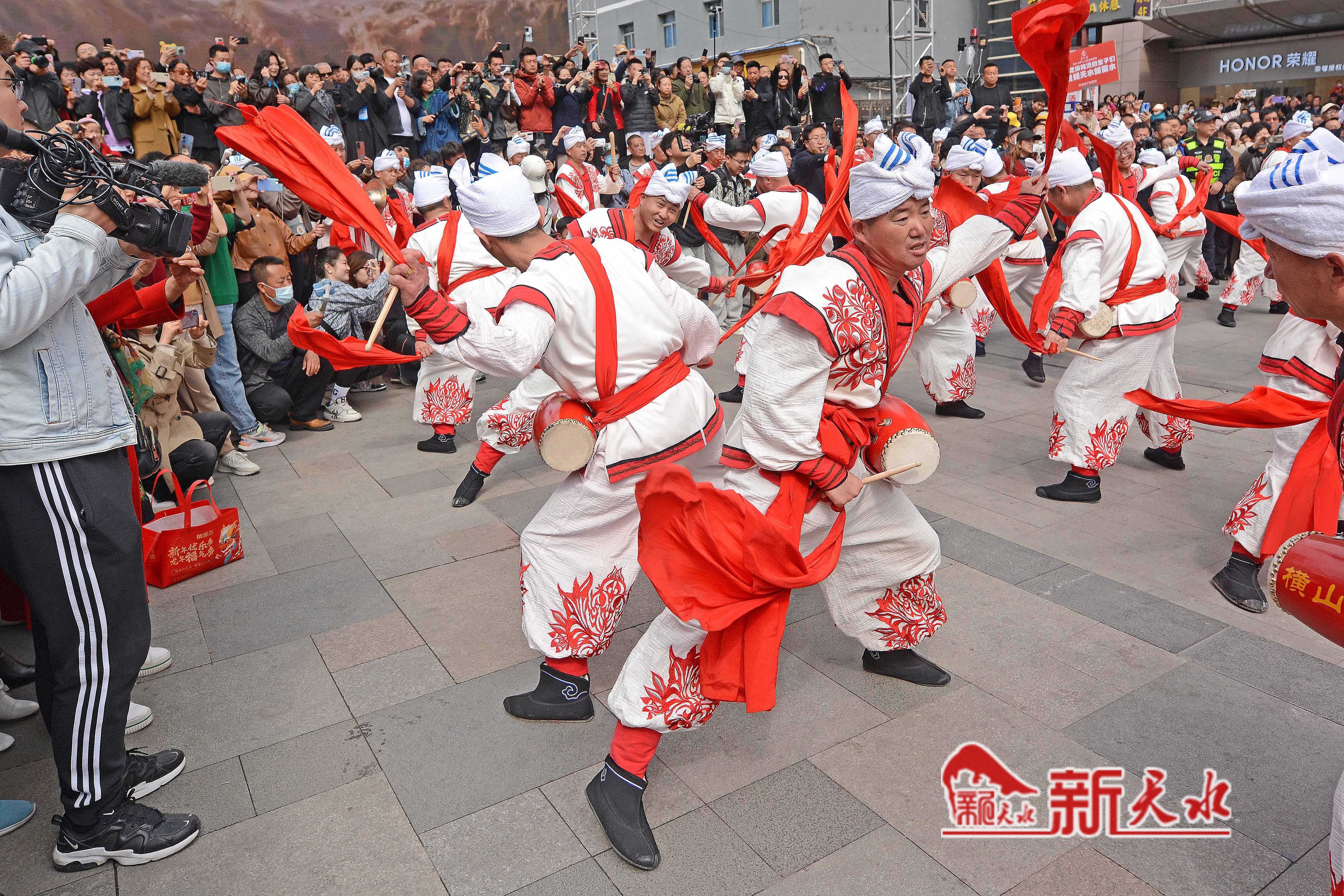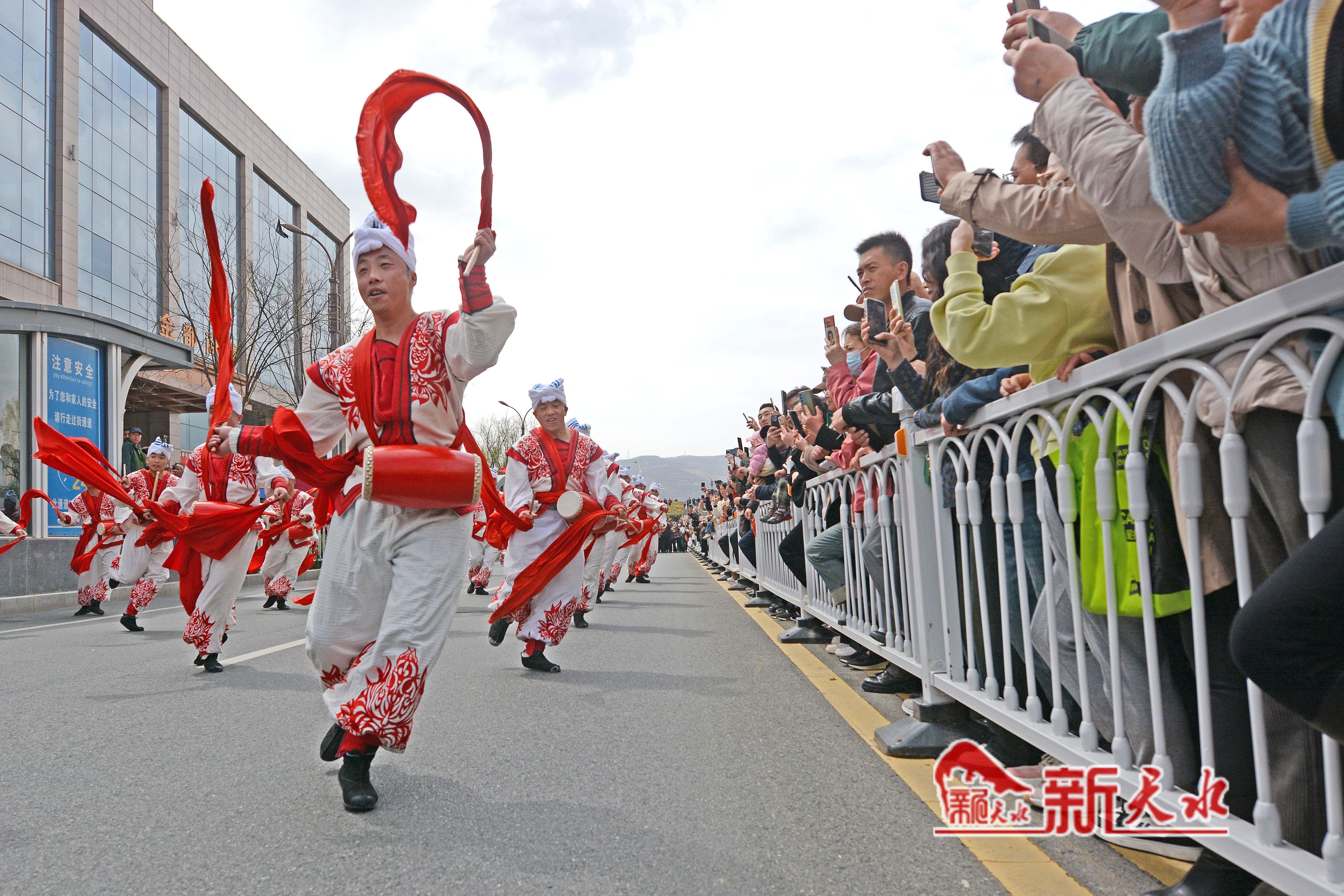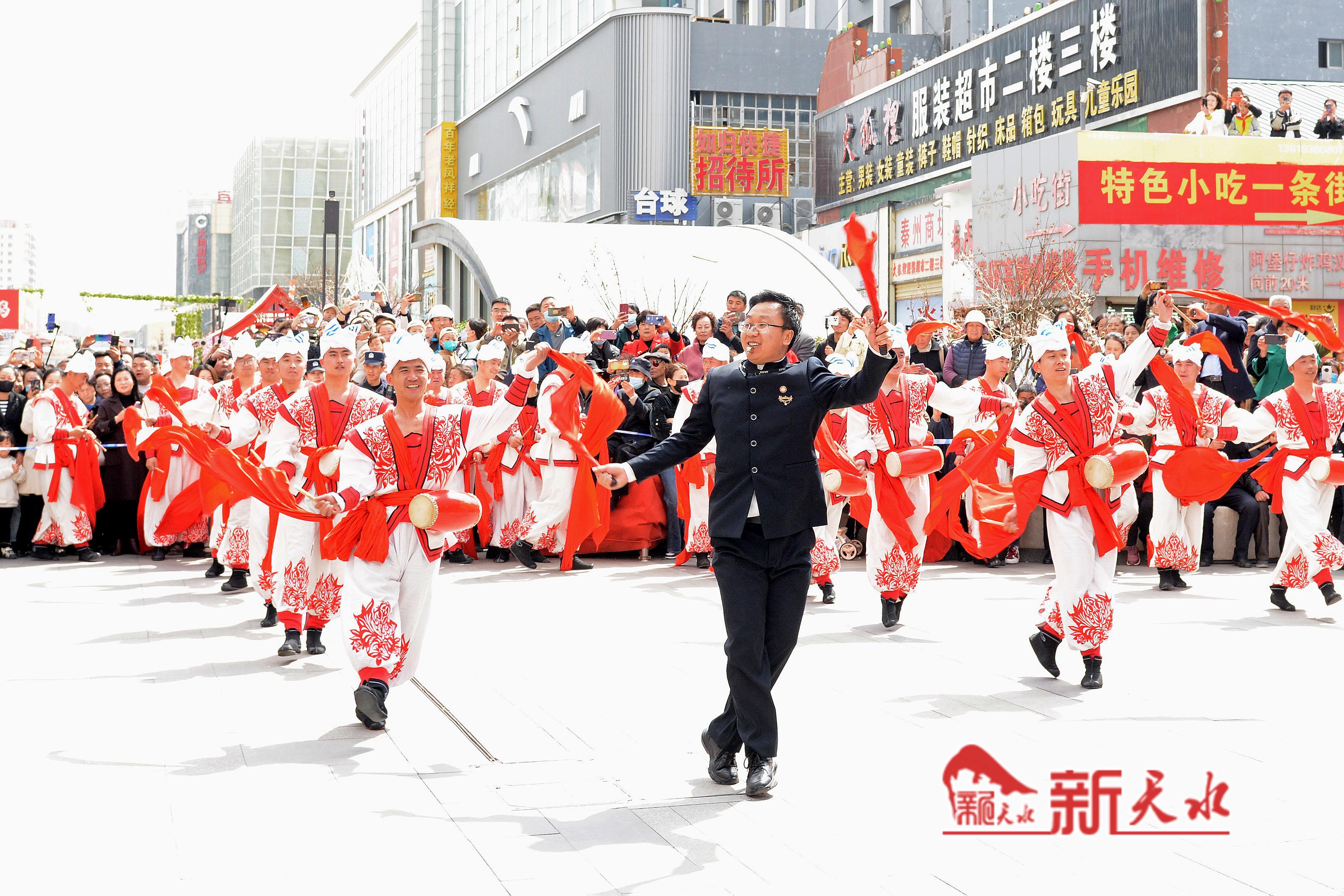 3月27日,陕西省榆林市横山老腰鼓表演队在天水市秦州、麦积两区“激情鼓舞”,为天水麻辣烫鼓劲加油,体现陕甘一家亲的深情厚意。