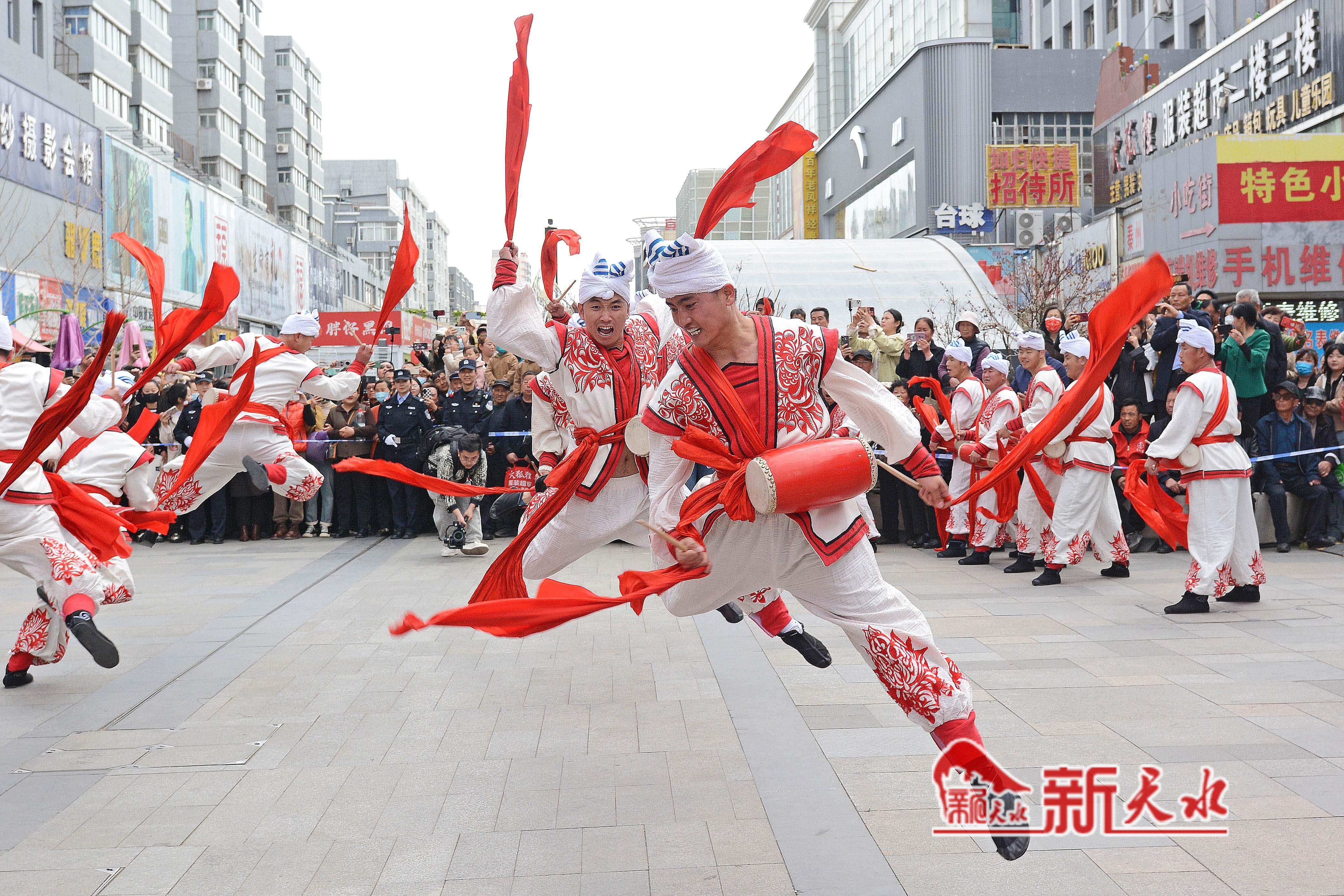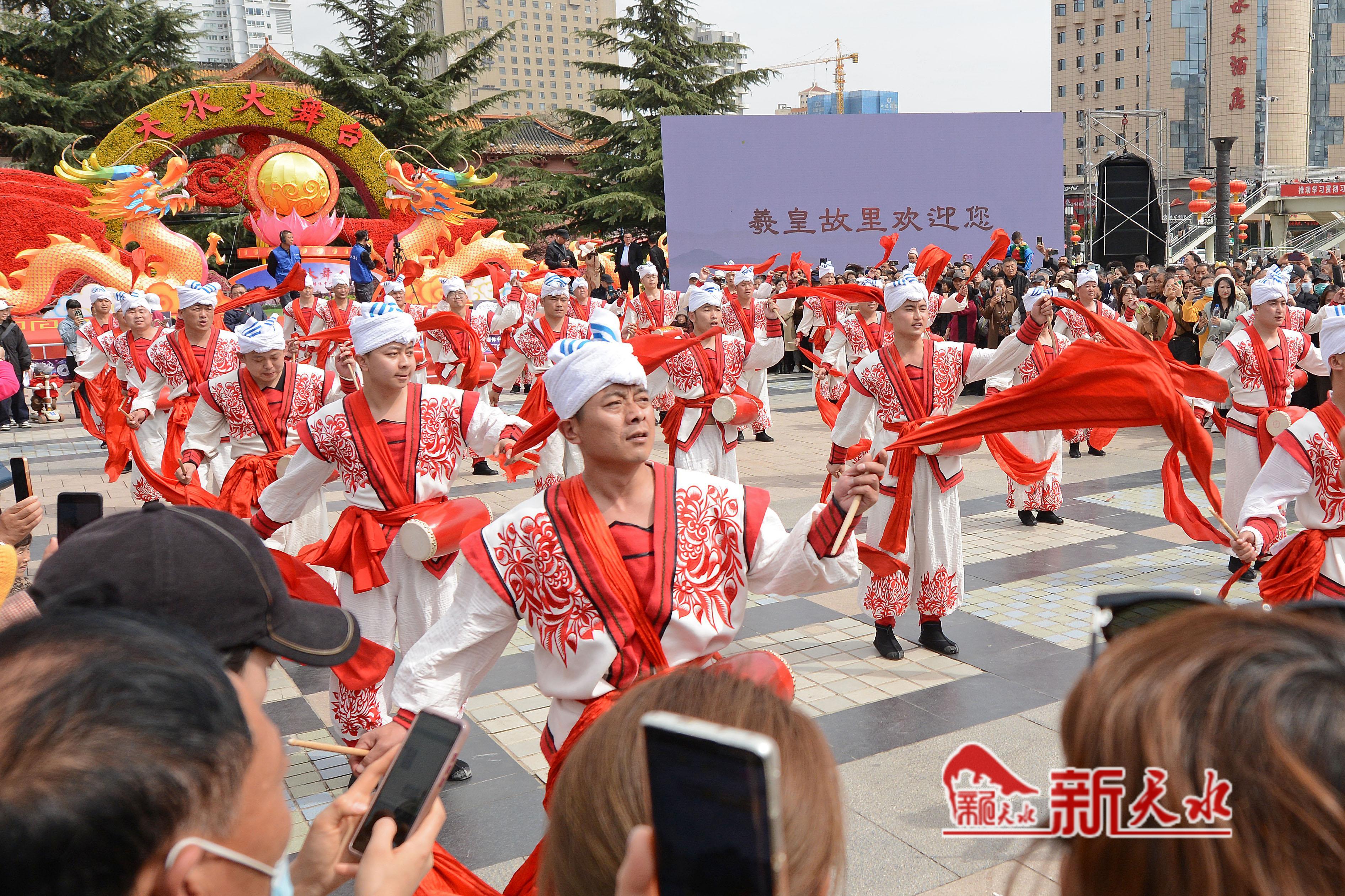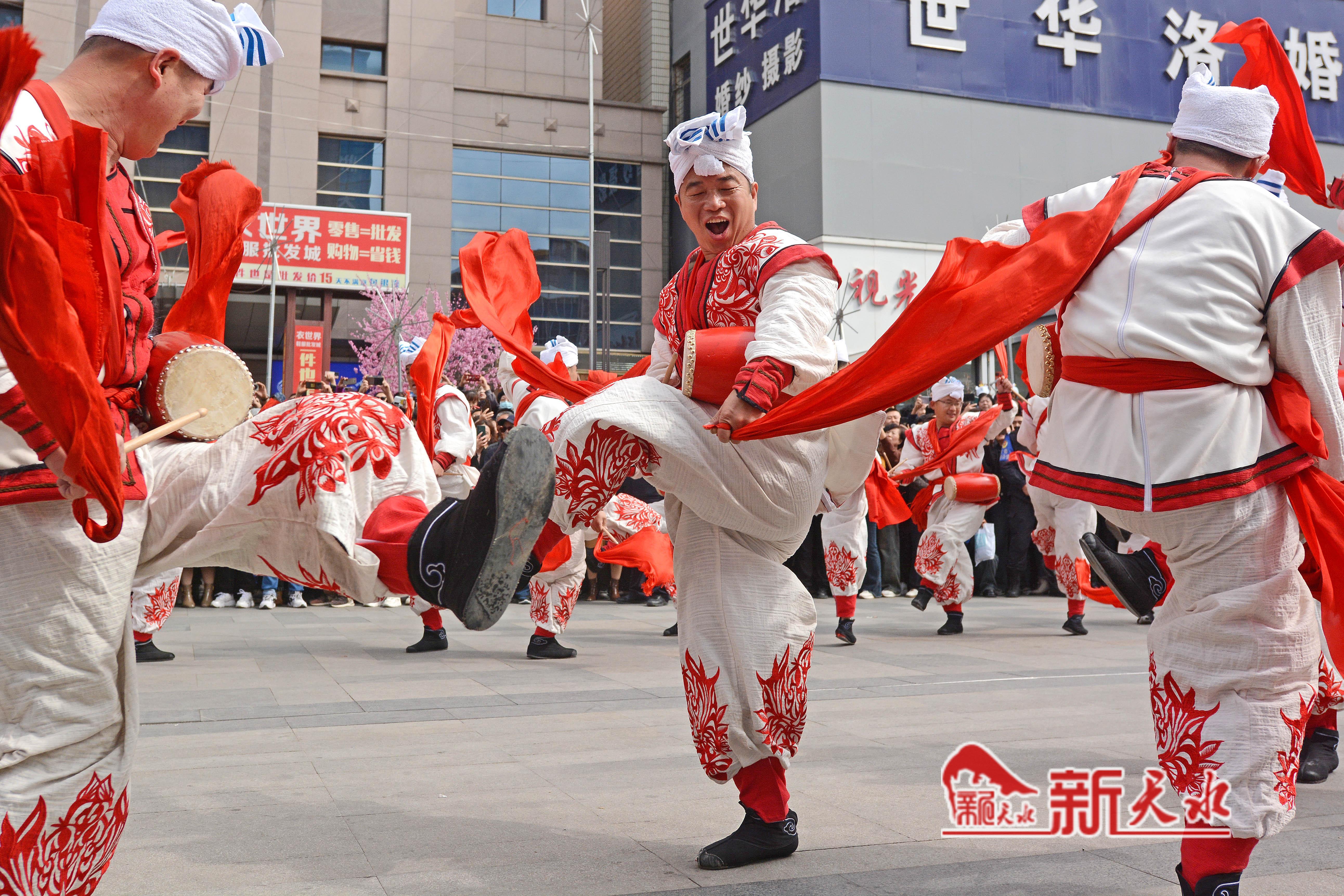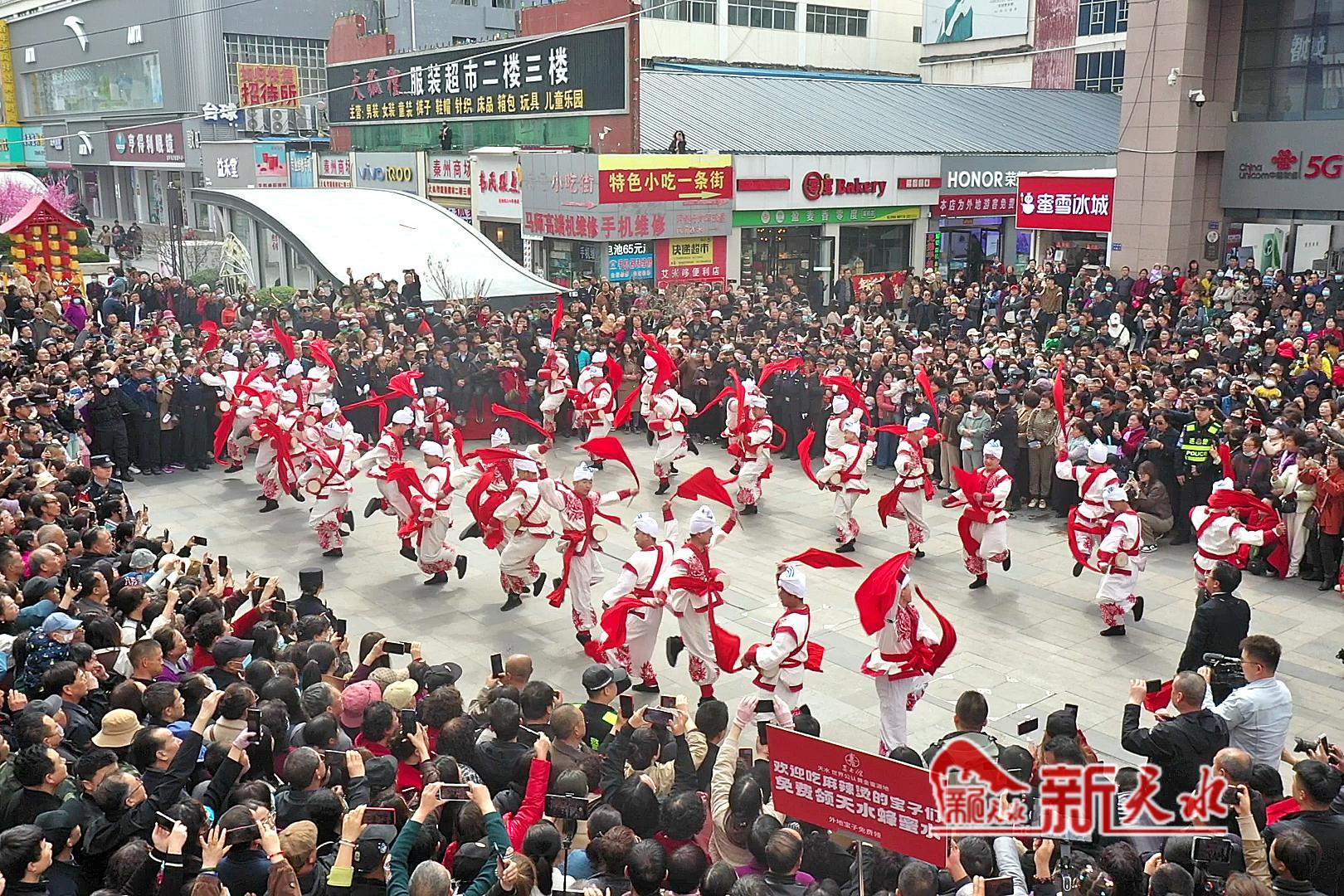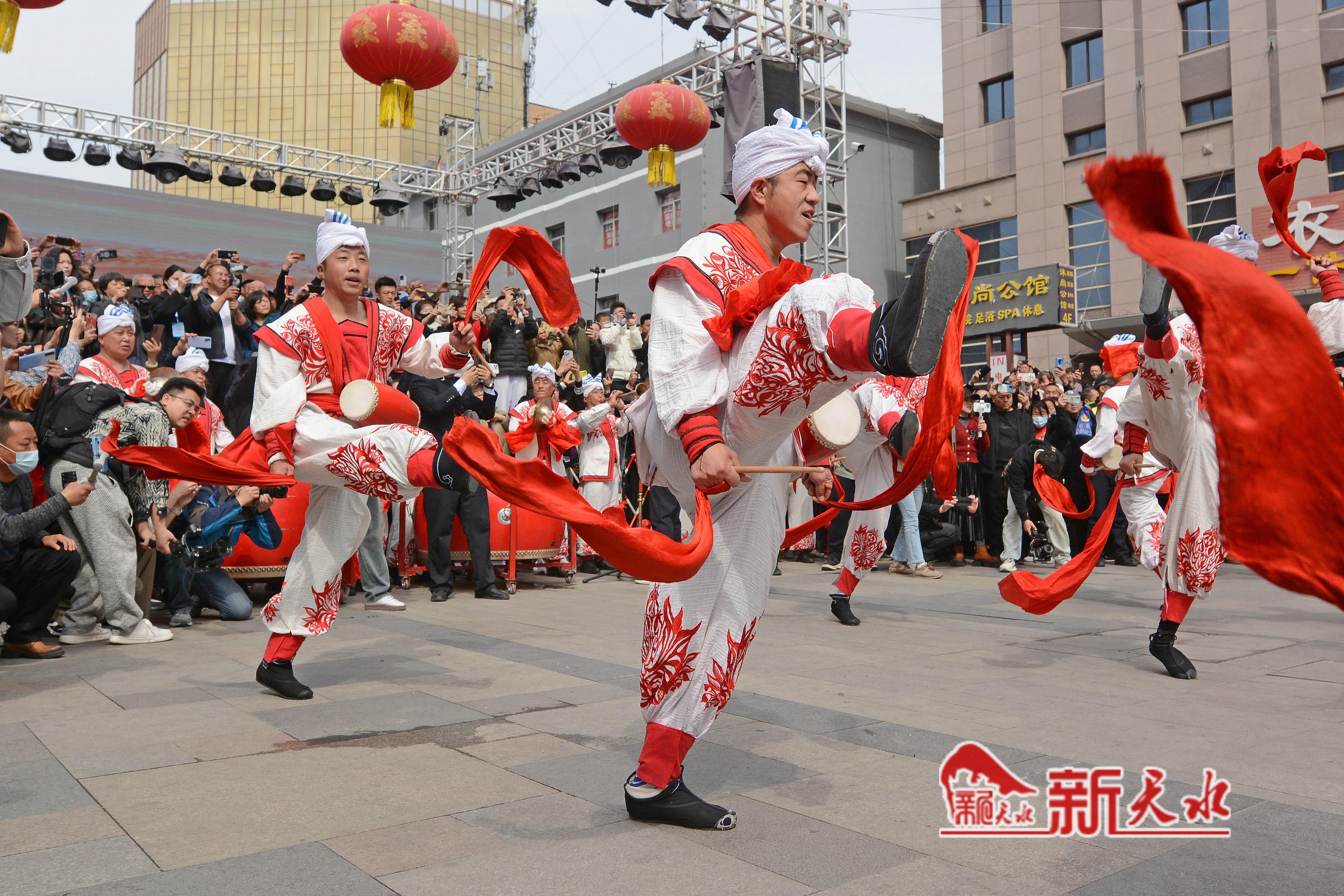 3月27日,陕西省榆林市横山老腰鼓表演队在天水市秦州、麦积两区“激情鼓舞”,为天水麻辣烫鼓劲加油,体现陕甘一家亲的深情厚意。