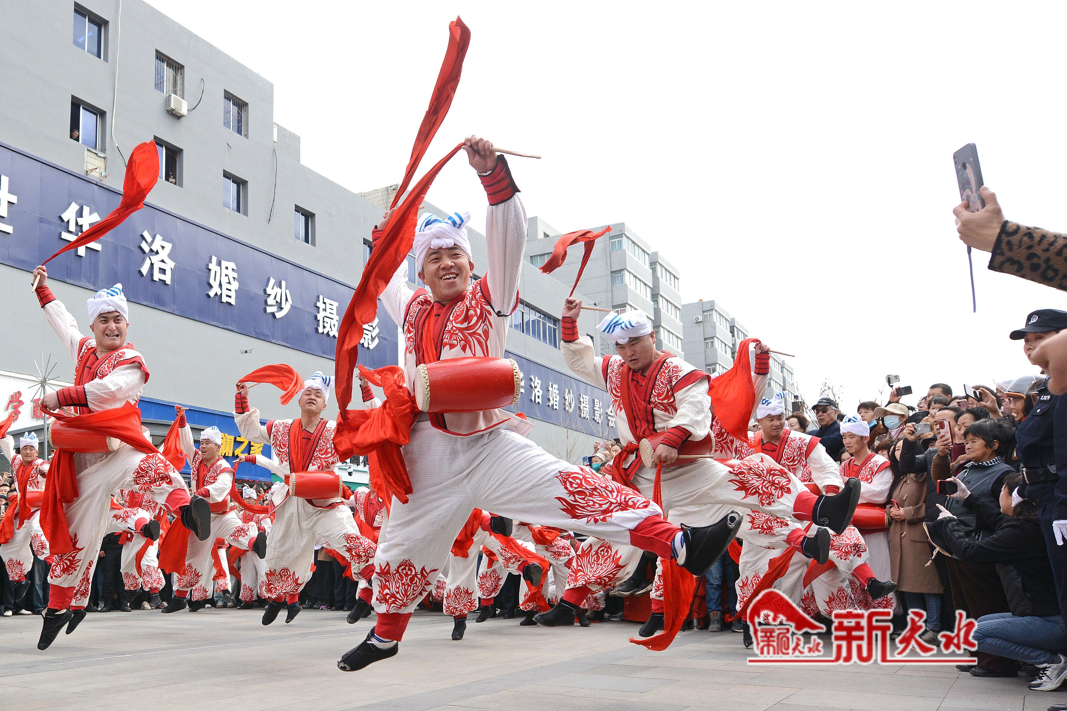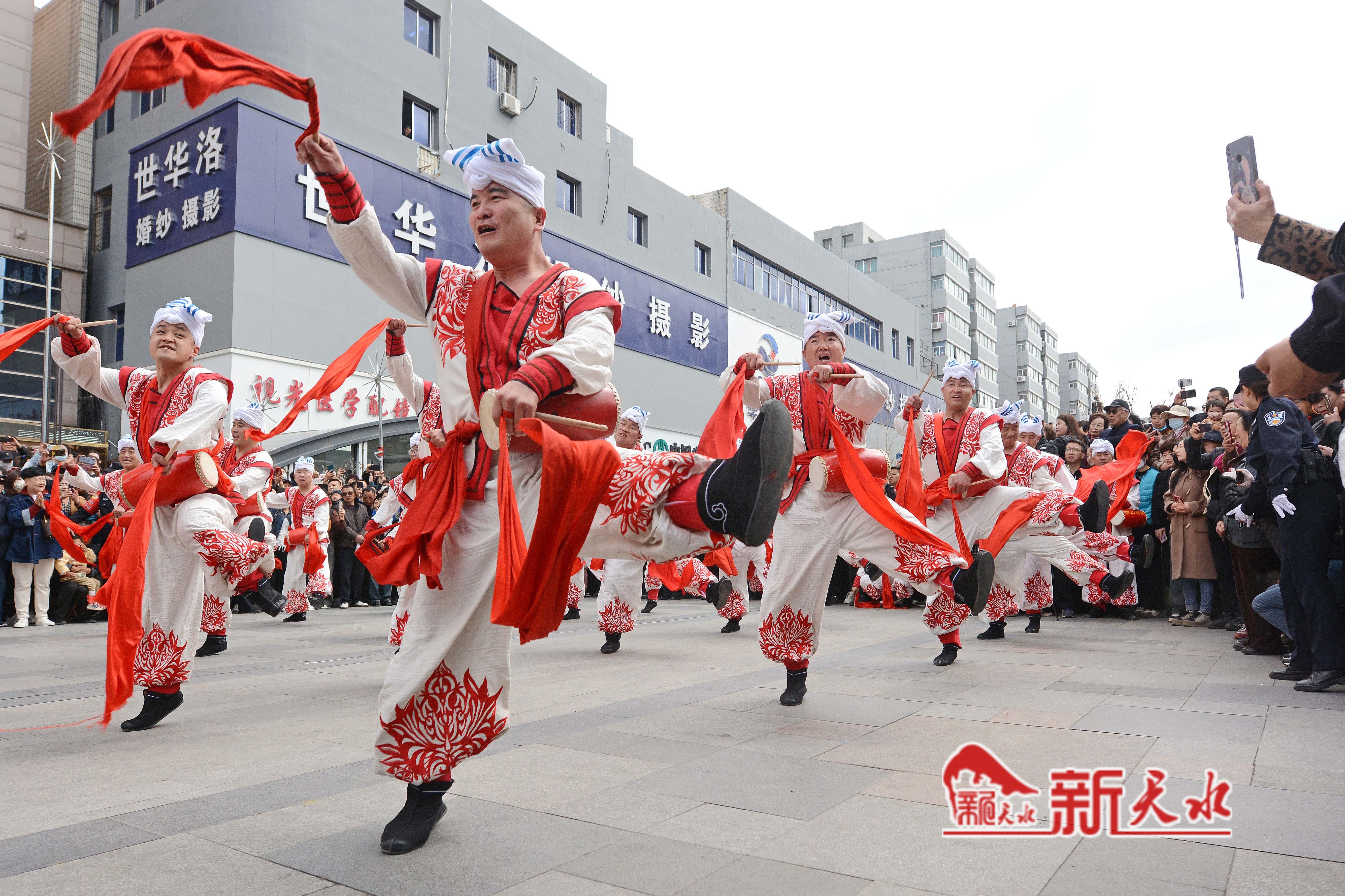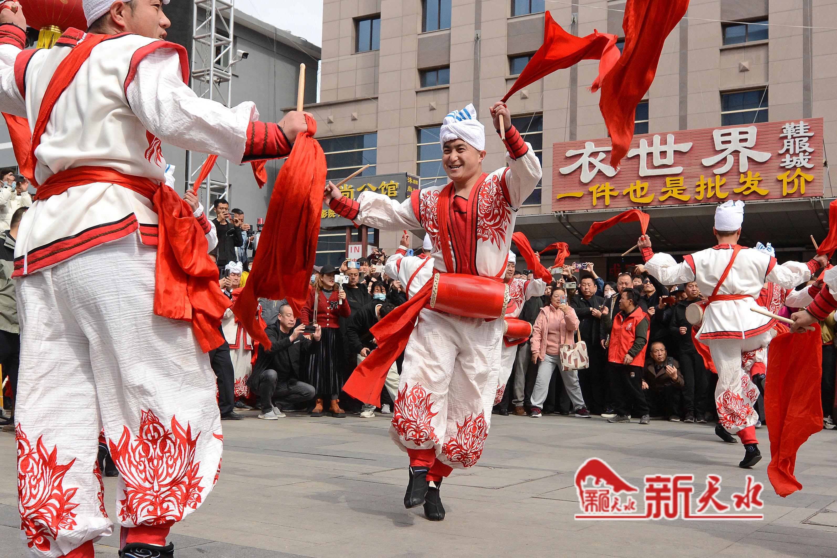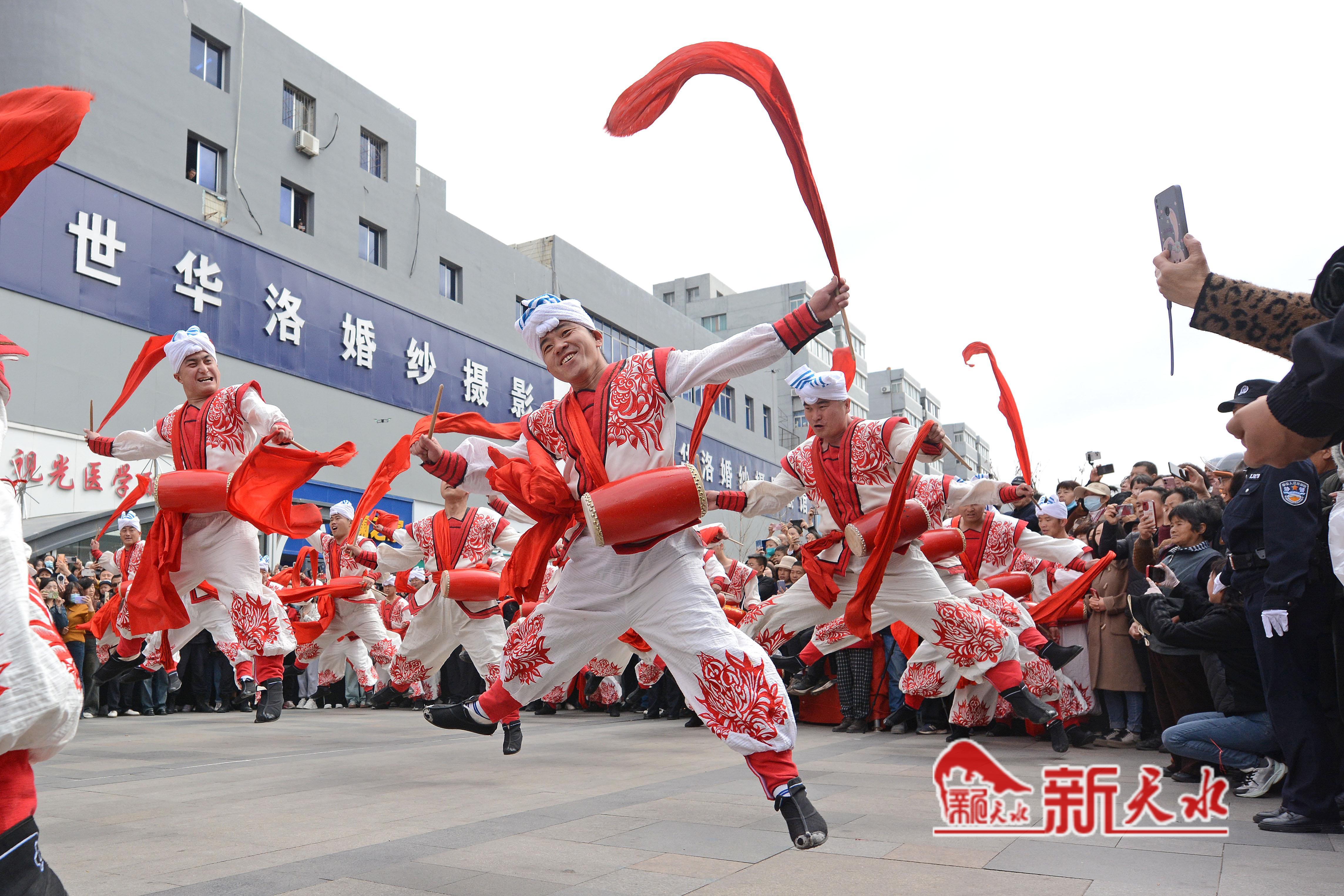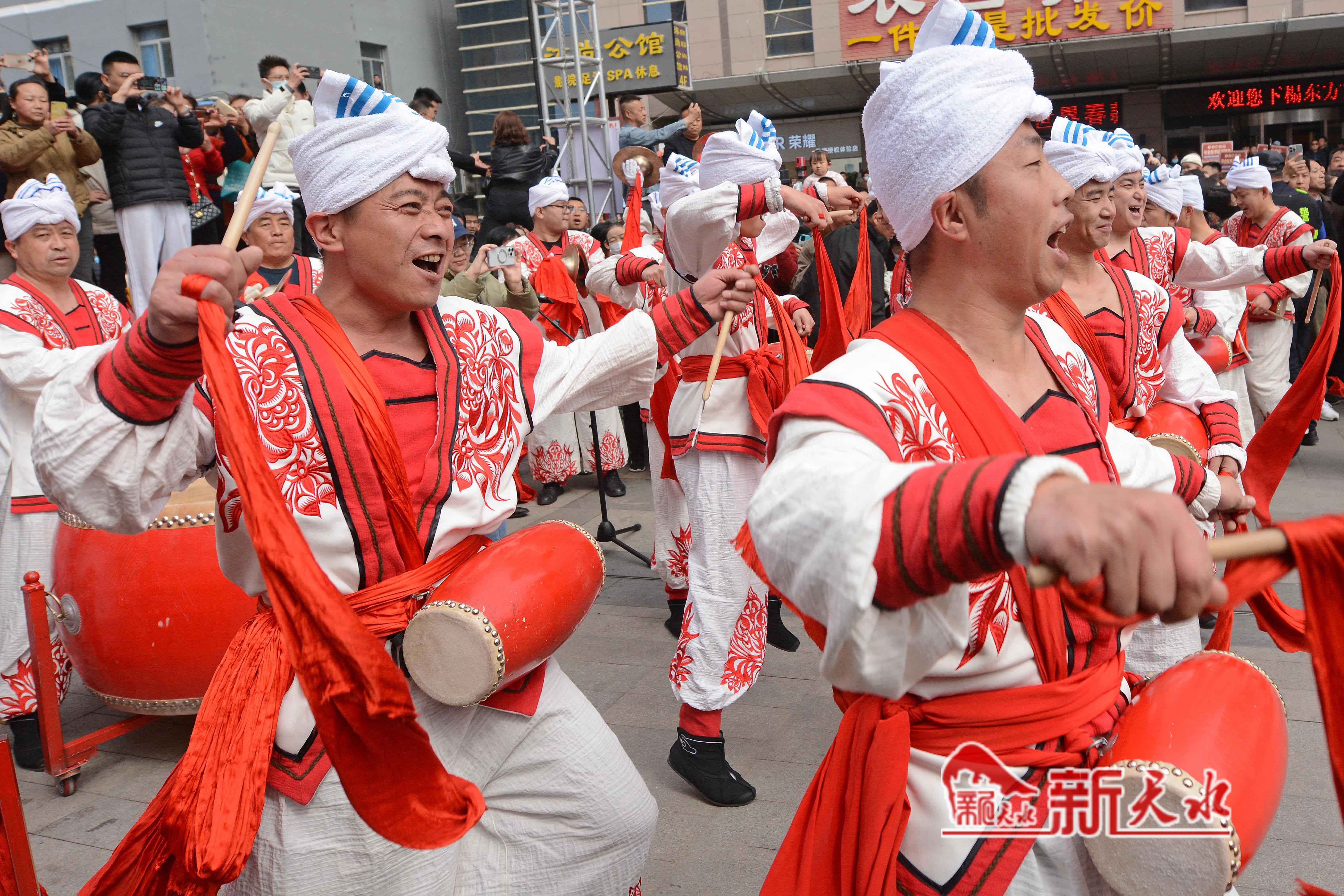 3月27日,陕西省榆林市横山老腰鼓表演队在天水市秦州、麦积两区“激情鼓舞”,为天水麻辣烫鼓劲加油,体现陕甘一家亲的深情厚意。