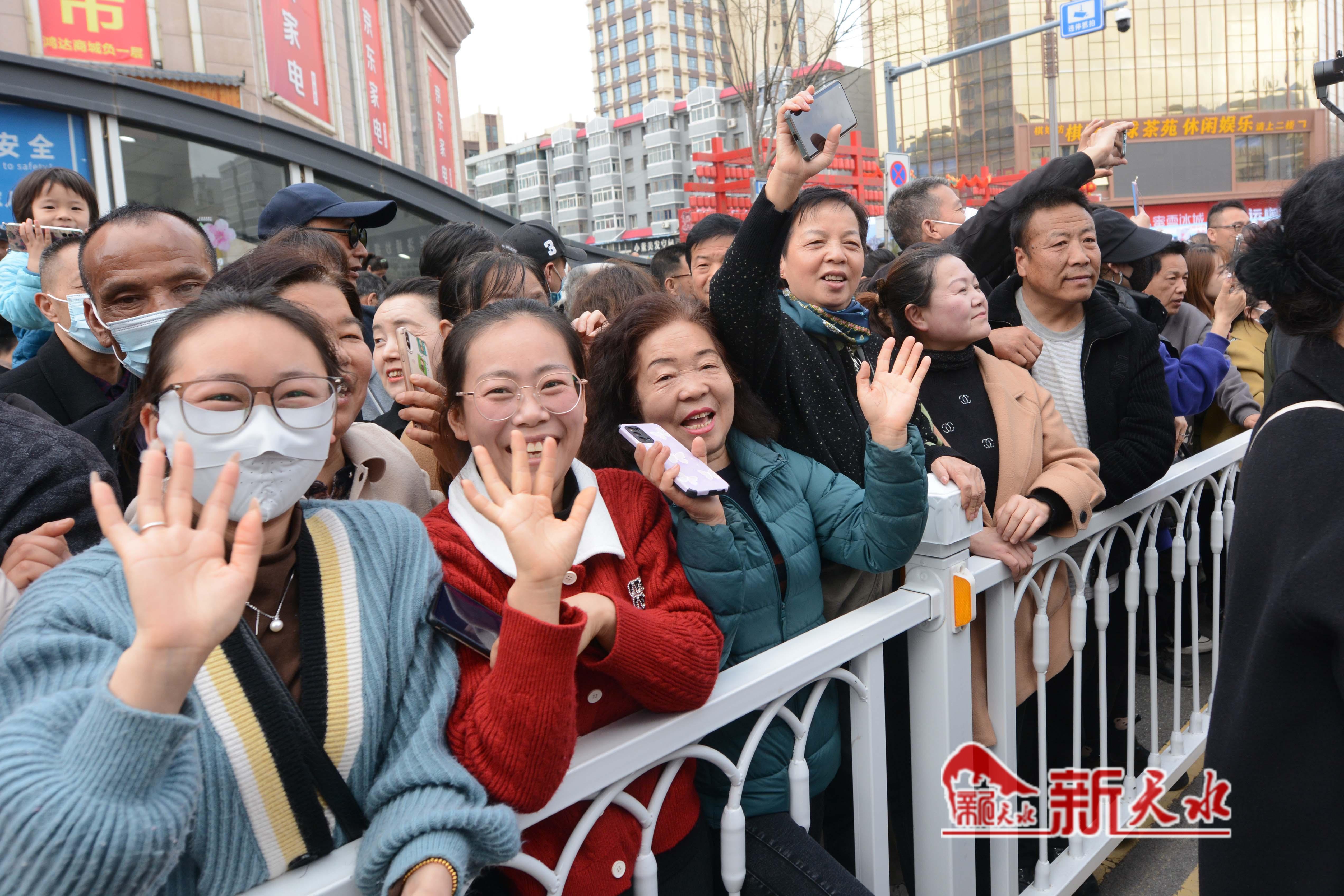 麦积区市民向陕西省榆林市横山老腰鼓表演队队员挥手致意
