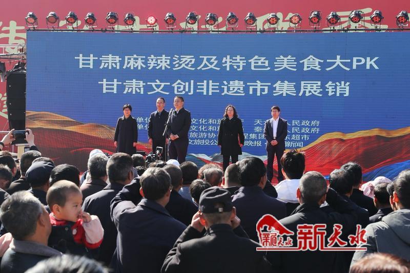 新天水讯【记者王琴】烟火升腾汇聚八方食客,陇原文创共襄文旅盛宴。3月29日上午,由甘肃省文化和旅游厅、天水市政府共同举办的“甘肃麻辣烫及特色美食大PK”活动和“甘肃文创非遗市集展销”活动在天水伏羲广场拉开帷幕。省文化和旅游厅二级巡视员秦炳峰,天水市委常委、副市长张宇晶出席活动并分别致辞。