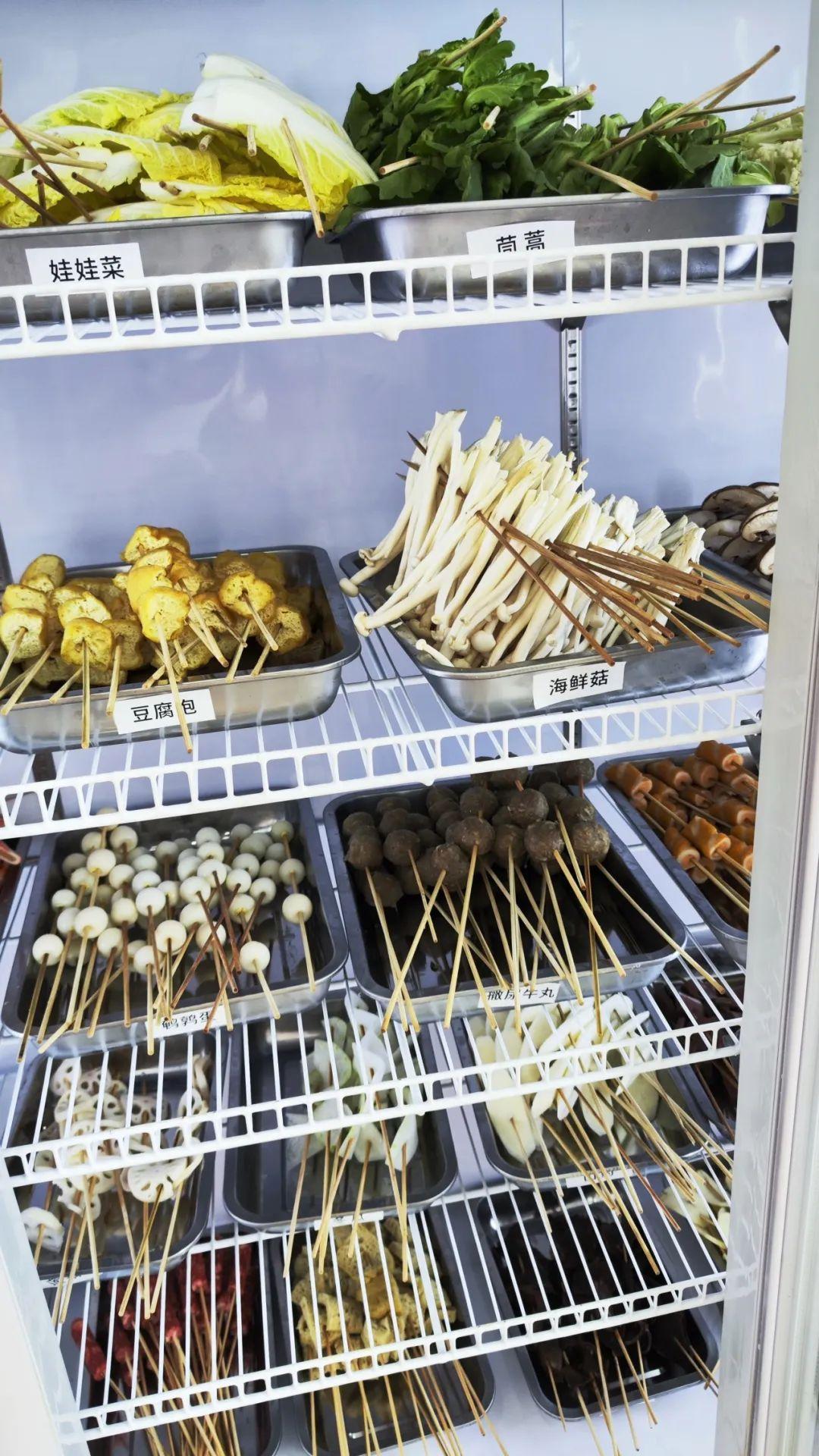店里的菜品,整齐地摆放在冰柜里。土豆丸子、豆泡、香菇、海带、莲藕、娃娃菜、茼蒿、蟹棒、鹌鹑蛋……你能想到的烫菜,这里都有。