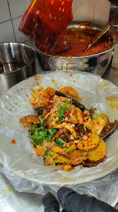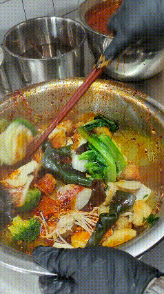 选好荤菜、素菜,一并装在篮子里,递给老板杨先生。只见他先把食材放进大汤锅里烫煮,接着拿出了个大拌碗。煮好的食材,直接倒进碗里,迅速翻腾着,很快就裹上了一层料粉,光是看着就满口生香。一阵翻滚后,再给串串们浇上红油,来个“灵魂的洗礼”。