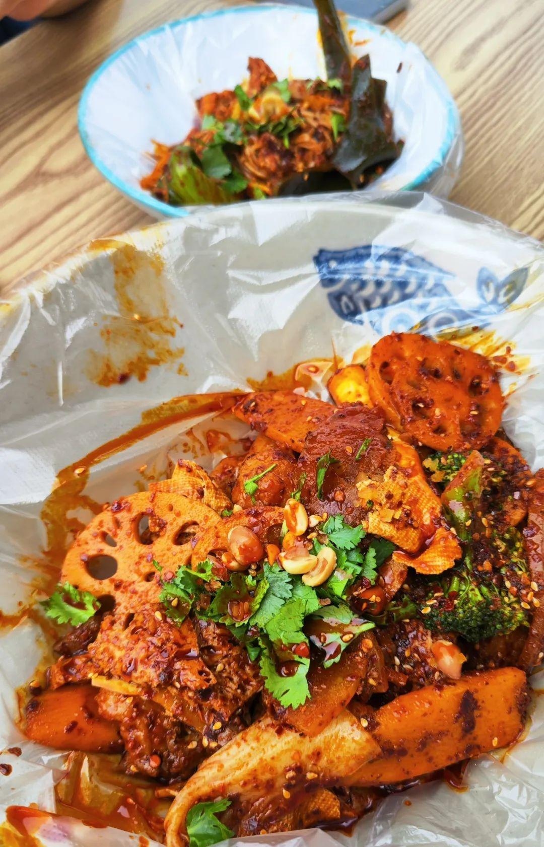 且慢,别看这么红彤彤的颜色,其实这是微辣哦。食客一开始也担心会不会太辣,一尝发现其实是“香而不辣”。配菜全都浸润了满满的辣子油,入口第一感受就是满嘴辣椒香,感觉香味胜过了辣味!