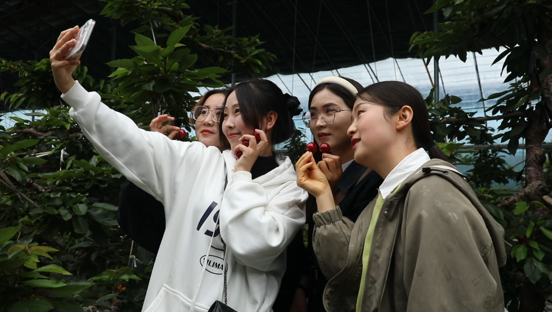 在张家川县裕丰果品种植农民专业合作社的樱桃大棚里,一颗颗红玛瑙般的大樱桃挂满枝头,晶莹剔透,令人垂涎欲滴。这里的大樱桃品种主要是美早,有含糖量高、口感好、果肉硬、耐储运的优势。为了保障樱桃的品质,大棚的员工们忙着进行后期的管护工作。合作社工人张春梅笑着说:“现在樱桃马上就要上市了,我们主要是掐尖,让樱桃吸收到更多的营养,这样就会长得更大、更好。”