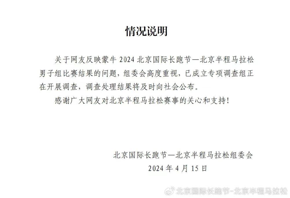 新华社北京4月15日电(记者李春宇、吴俊宽)北京半程马拉松赛事组委会15日发布公告,表示针对男子组比赛结果,已成立专项调查组正在开展调查,调查处理结果将及时向社会公布。